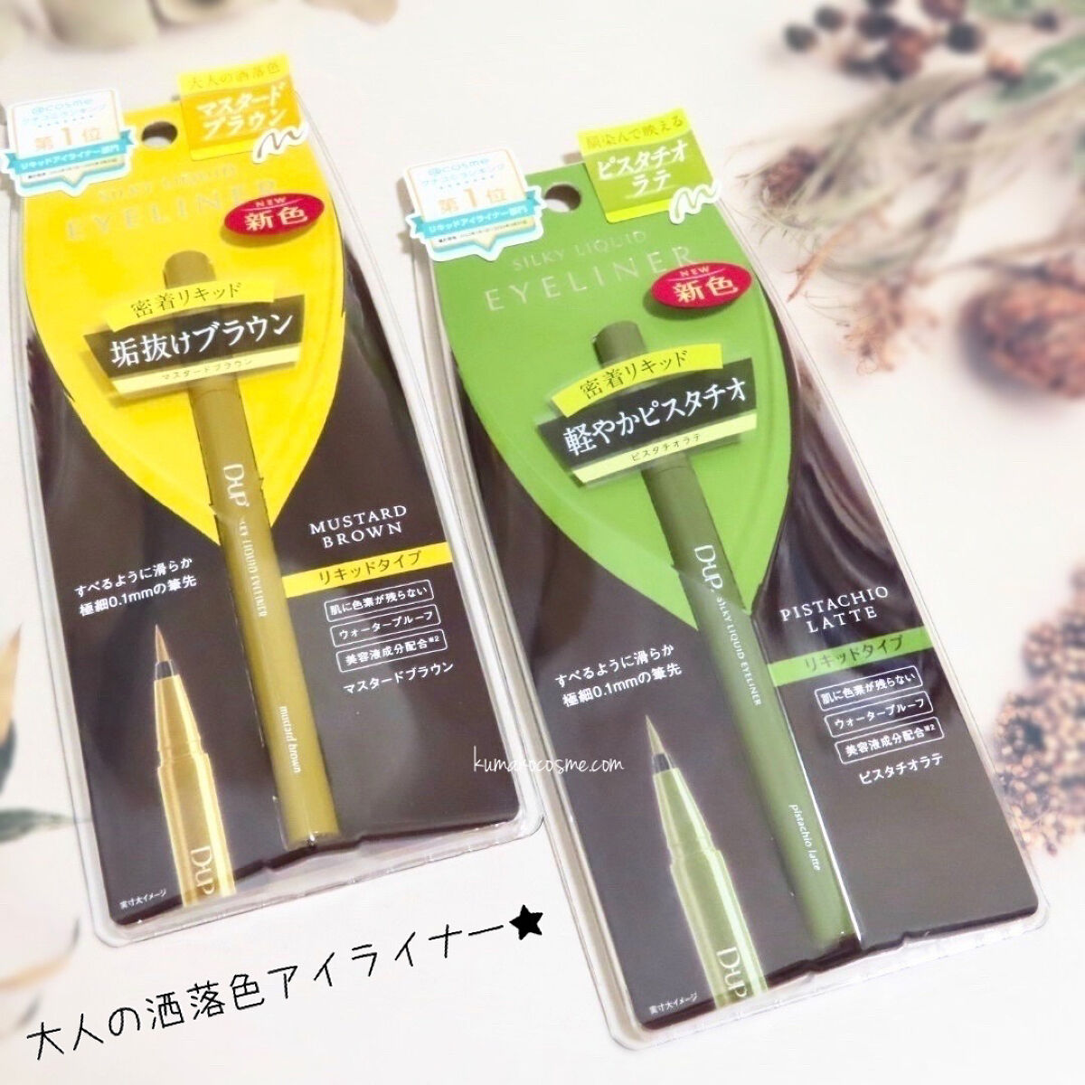 - 筆先までずっとなめらか、目尻で感動するリキッドアイライナー。 必要な量が肌にのる新設計で、まぶたの上をすべるような、滑らかな描き心地。しなやかでコシのある筆が、筆圧のコントロールを容易にし、太いラインも細いラインも思い通りに仕上げます。水、汗、涙に強いウォータープルーフタイプなのに、通常洗顔で簡単オフ。肌に色素が残らない顔料を使用。5種類の美容液成分を従来品の200%配合し、メイクしながら目元ケアまで。 ●ブラウンブラック ※2020年9月12日 バラエティショップ先行発売 ●漆黒ブラック ※2020年12月頃発売予定 ●ナチュラルブラウン ※2020年12月頃発売予定 ●シフォンブラウン 「毎日メイクに透明感と抜け感」 ブラウンでも、グレーでも、ベージュでもないニュアンスカラー。 自然な印影で素の目元を際立て、頑張りすぎない、ふんわりとした目元に。 ●アプリコットブラウン 「じゅわっと血色感。 肌に馴染むおしゃれカラー」 温かみのあるアプリコットがじゅわっと滲む血色感を目元に演出。 肌馴染みが良いので、カラーライナーに抵抗がある方もブラウンの延長線上で楽しめる、使いやすい色味です。 ”ちょっとオシャレ”な空気感を演出するカラー。 ●ピンクショコラ アイライナー 「ピンクが溶け込む濃厚ブラウン」 肌馴染みが良く、目元にじんわり血色感をプラス。 さりげなく女性らしさが加速するようなカラー。 ●ピスタチオラテ (2022年7月29日(金)発売) 「“目尻”に抜け感アクセント」 肌に馴染むのに映える絶妙なグリーン。 トレンドカラーに“くすみ”と“抜け感”をプラスしたまろやかな発色。 ●マスタードブラウン 「“イエロー”が揺れる、大人の洒落色」 (2022年7月29日(金)発売) まるで太陽のような暖かさを感じる新しいブラウン。 ほんのり感じるイエローでメイクが一気に垢抜ける稀有な色。 ●シフォンピンク(2023年2月10日発売) 「ふんわり柔らか"まろみピンク"」 甘くなりすぎない青みニュアンスで目元の透明感UP。 目元を引き締め、ピンクメイクにありがちな腫れぼったさを解消。 ●ミルクカプチーノ(2023年4月21日発売) まろやかな深みの“優しい締め色” どんなメイクにも合わせやすいカラー。 自然な陰影でさりげなく目幅を拡張します。 ●グレーカシミア(2023年10月1日発売) ブラウンがほんのり溶け込んだ、暖色グレー まろやかな発色で、パーソナルカラーを問わず肌に馴染む 目元の陰影になりすまし、抜け感と目力を欲張りに叶える ●ダークフィグ(2024年6月1日発売) するする”なめらか。描きやすいのに、落ちにくい。 クッキリ可愛いほの甘ダークブラウン ●ピーチモカ(2024年8月1日発売) ふわっと自然に盛れる“桃色ブラウン” ほんのり血色感で目元にうるみ感を演出 ●スターダストブラウン(2024年12月11日発売) キラッと繊細に輝く''星屑ブラウン'' 透け感のあるダークブラウンの色味とラメの輝きが、目元に艶のある立体感を演出 ●チャコールモカ(2025年4月10日発売) 目元を締める''深みグレージュ'' 黄みや赤みに偏りすぎない絶妙な色設計で、自然に目元を強調