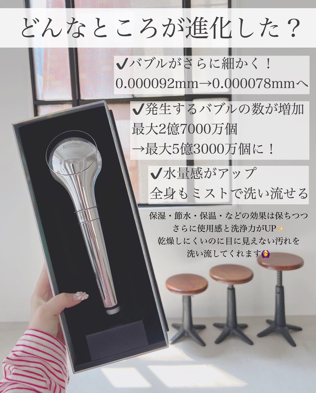 - 最大2億7,000万個※1ものファインバブルが発生。浴びるだけで頭の先から足の先まで、全身の汚れをくまなく※2洗い流す革新的なシャワーヘッドです。保湿効果もあり、浴槽に入れれば温浴効果も。選べる3つのモードで、いつものバスタイムが豊かに、快適に。 ※1:ミスト水流1㎖あたり(水温40℃±5℃・流量1.3L/分)に含まれるウルトラファインバブルとマイクロバブル発生量の合計値(循環回数15回/水質・環境・時期・使用モードにより数値は変動します)。2021年4月19日~2021年4月23日・計15回の測定による最大値(平均値は約1.63億個)。第三者機関にて測定。 ※2:全身についた汚れをシャワーでくまなく洗い流すこと。