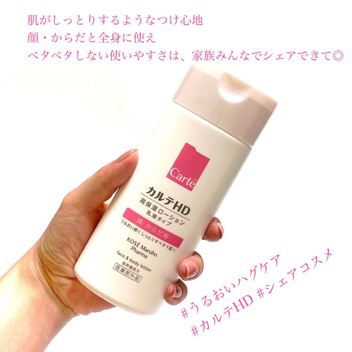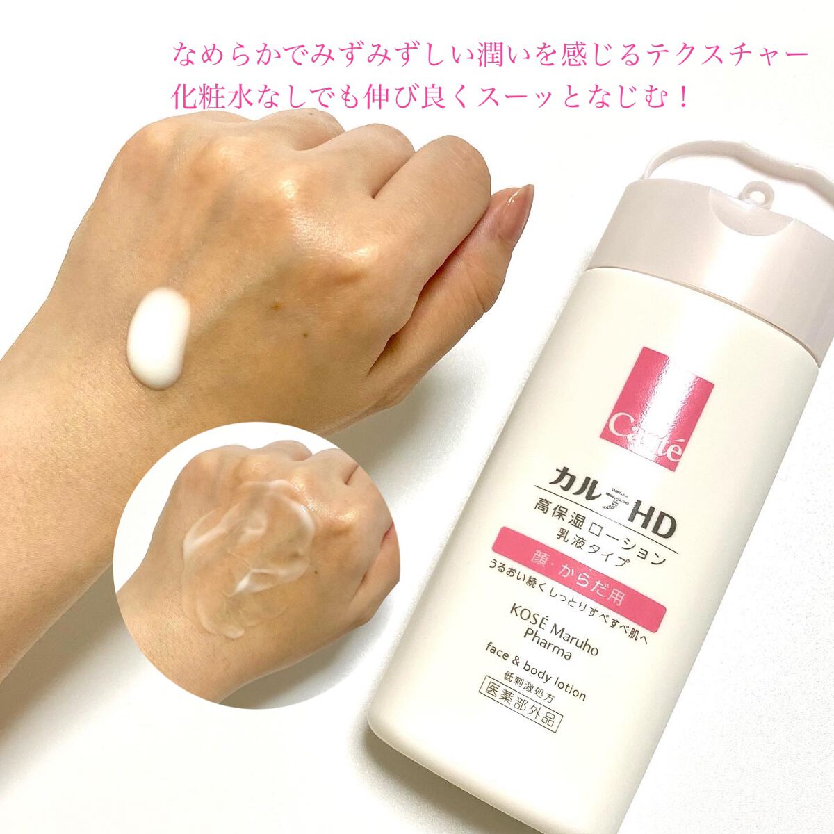 - 【高保湿フェイス&ボディローション】 顔にもからだにも。しっとりやわらか肌つづく。 信頼の保水有効成分「ヘパリン類似物質HD※」配合、低刺激処方の高機能フェイス&ボディローションです。 ヘパリン類似物質HDが、気温・湿度の変化で乾燥しやすいからだの肌のうるおい構造(角層ラメラ)を立て直し、しっとりやわらか肌に導きます。 2種のこだわりオイル配合で、しっとりするのにべたつかず、なめらかにのびひろがる使用感。敏感な肌でもまさつによるストレスがなく、全身をうるおいで満たします。 カルテHDシリーズとしては初めてお子さま(3歳以上)にもお使いいただける商品。 ・ボトルタイプ(220mL) ・ポンプタイプ(410mL) ・つめかえ用(370mL)の3種でラインアップ。 ご自身の保湿に、ご家族や大切なかたの保湿に。みずみずしくなめらかなうるおいが全身を包み込むフェイス&ボディローションです。 ※保水有効成分ヘパリン類似物質のこと <販売名:HD フェイスボディL>