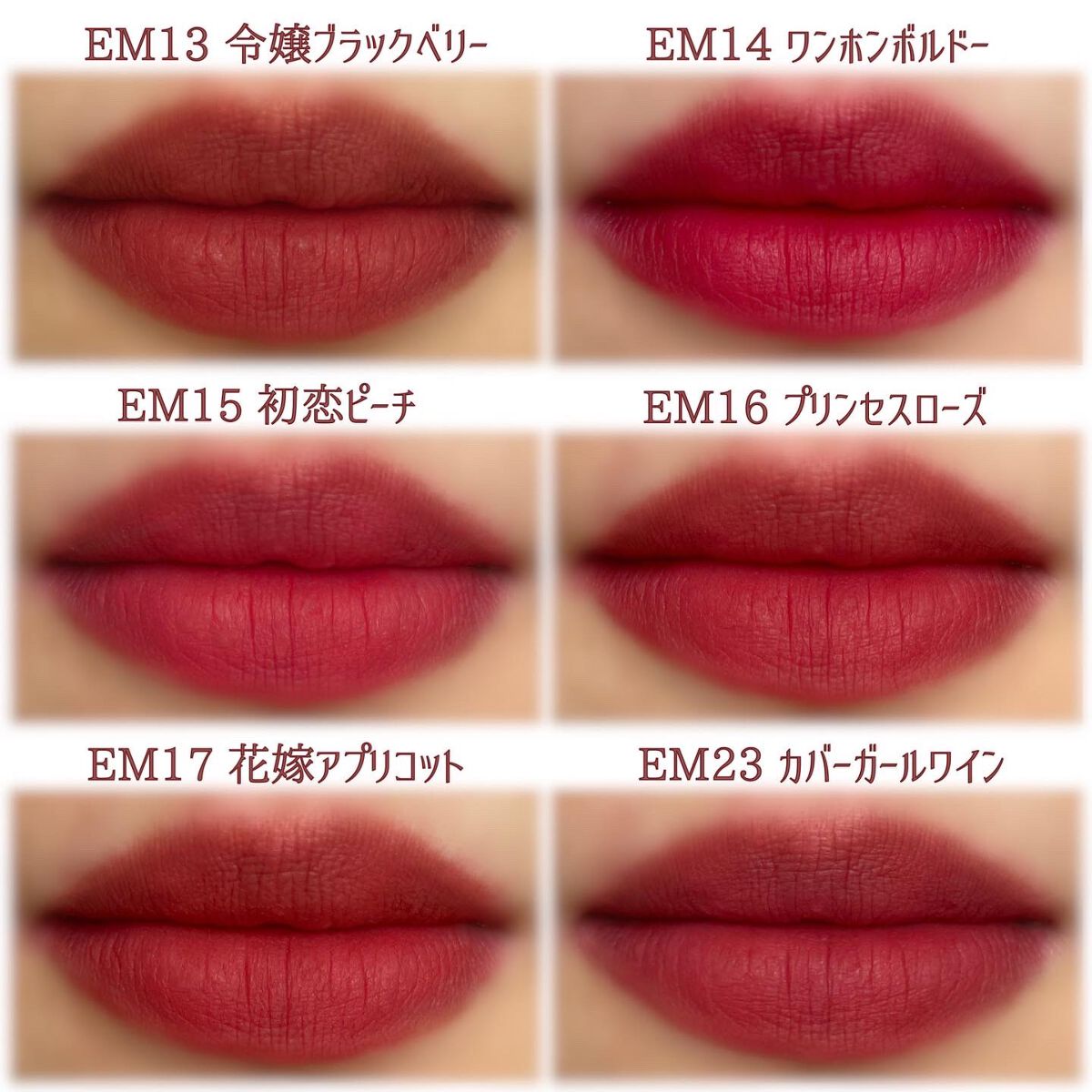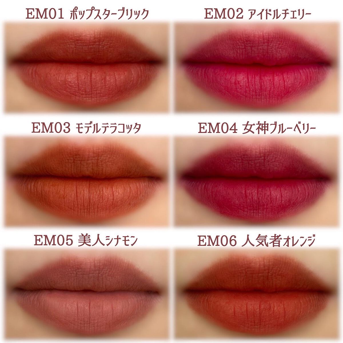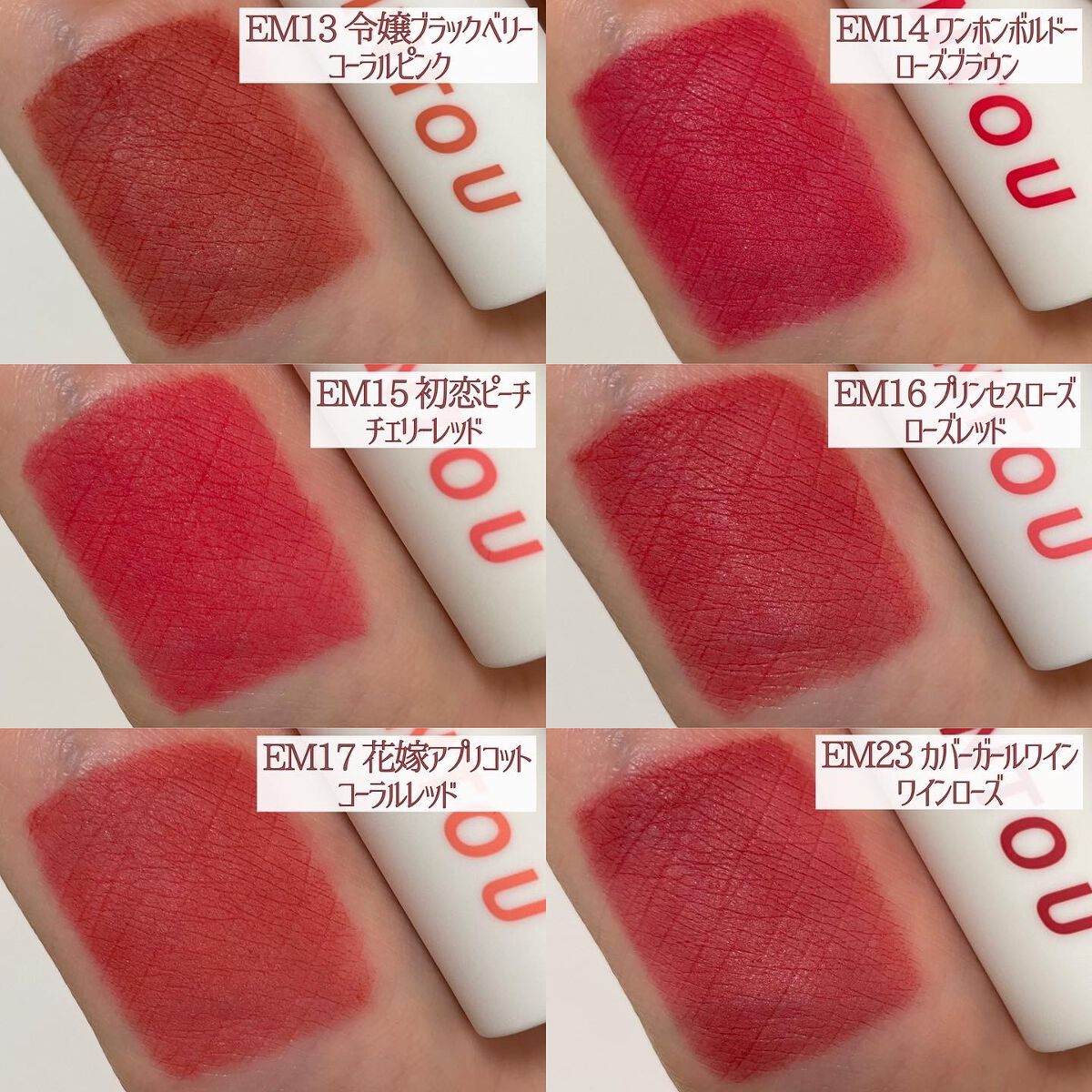 - <EM-J01 ピンクミスト> ジメチコン、ジメチコンクロスポリマー、トリベヘニン、リンゴ酸ジイソステアリル、(ビニルジメチコン/メチコンシルセスキオキサン)クロスポリマー、酸化チタン、セチルPEG/PPG-10/1ジメチコン、イソステアリン酸ソルビタン、(VP/ヘキサデセン)コポリマー、トリイソステアリン酸ポリグリセリル-2、ジイソステアリン酸ポリグリセリル-2、赤230(1)、赤202、黄4、香料、デヒドロ酢酸、酸化鉄 <EM-J02 ベルベットムード > ジメチコン、ジメチコンクロスポリマー、トリベヘニン、リンゴ酸ジイソステアリル、酸化チタン、(ビニルジメチコン/メチコンシルセスキオキサン)クロスポリマー、セチルPEG/PPG-10/1ジメチコン、イソステアリン酸ソルビタン、(VP/ヘキサデセン)コポリマー、トリイソステアリン酸ポリグリセリル-2、酸化鉄、赤202、ジイソステアリン酸ポリグリセリル-2香料、ジメチルシリル化シリカ、デヒドロ酢酸、黄4、黄5 <EM01 ポップスターブリック> ジメチコン、ジメチコンクロスポリマー、トリベヘニン、トリイソステアリン酸ポリグリセリル-2、酸化鉄、(ビニルジメチコン/メチコンシルセスキオキサン)クロスポリマー、セチルPEG/PPG-10/1ジメチコン、イソステアリン酸ソルビタン、(VP/ヘキサデセン)コポリマー、黄5、リンゴ酸ジイソステアリル、赤202、ジイソステアリン酸ポリグリセリル-2、香料、デヒドロ酢酸、水添ロジン酸メチル <EM03 モデルテラコッタ> ジメチコン、ジメチコンクロスポリマー、トリイソステアリン酸ポリグリセリル-2、トリベヘニン、黄4、酸化鉄、(ビニルジメチコン/メチコンシルセスキオキサン)クロスポリマー、セチルジメチコンコポリオール、イソステアリン酸ソルビタン、(VP/ヘキサデセン)コポリマー、リンゴ酸ジイソステアリル、香料、デヒドロ酢酸、水添ロジン酸メチル <EM05 美人シナモン> ジメチコン、ジメチコンクロスポリマー、トリベヘニン、リンゴ酸ジイソステアリル、酸化チタン、酸化鉄、トリイソステアリン酸ポリグリセリル-2、(ビニルジメチコン/メチコンシルセスキオキサン)クロスポリマー、セチルジメチコンコポリオール、イソステアリン酸ソルビタン、(VP/ヘキサデセン)コポリマー、香料、赤202、ジイソステアリン酸ポリグリセリル-2、デヒドロ酢酸、水添ロジン酸メチル <EM07 ファッショニスタココア> ジメチコン、ジメチコンクロスポリマー、トリイソステアリン酸ポリグリセリル-2、トリベヘニン、赤227、(ビニルジメチコン/メチコンシルセスキオキサン)クロスポリマー、酸化鉄、セチルジメチコンコポリオール、イソステアリン酸ソルビタン、(VP/ヘキサデセン)コポリマー、黄5、リンゴ酸ジイソステアリル、香料、デヒドロ酢酸、水添ロジン酸メチル <EM08 インフルエンサーモカ> ジメチコン、ジメチコンクロスポリマー、トリベヘニン、トリイソステアリン酸ポリグリセリル-2、(ビニルジメチコン/メチコンシルセスキオキサン)クロスポリマー、リンゴ酸ジイソステアリル、酸化鉄、酸化チタン、セチルジメチコンコポリオール、イソステアリン酸ソルビタン、(VP/ヘキサデセン)コポリマー、黄5、赤202、ジイソステアリン酸ポリグリセリル-2、香料、デヒドロ酢酸、水添ロジン酸メチル <EM09 セレブブラウン> ジメチコン、ジメチコンクロスポリマー、トリベヘニン、リンゴ酸ジイソステアリル、酸化鉄、酸化チタン、トリイソステアリン酸ポリグリセリル-2、(ビニルジメチコン/メチコンシルセスキオキサン)クロスポリマー、セチルジメチコンコポリオール、イソステアリン酸ソルビタン、(VP/ヘキサデセン)コポリマー、香料、赤202、ジイソステアリン酸ポリグリセリル-2、デヒドロ酢酸、水添ロジン酸メチル <EM10 クイーンローズティー> ジメチコン、ジメチコンクロスポリマー、トリベヘニン、トリイソステアリン酸ポリグリセリル-2、(ビニルジメチコン/メチコンシルセスキオキサン)クロスポリマー、リンゴ酸ジイソステアリル、酸化チタン、酸化鉄、セチルジメチコンコポリオール、イソステアリン酸ソルビタン、(VP/ヘキサデセン)コポリマー、赤227、香料、デヒドロ酢酸、水添ロジン酸メチル <EM11 アーティストモーヴ> ジメチコン、ジメチコンクロスポリマー、トリベヘニン、リンゴ酸ジイソステアリル、(ビニルジメチコン/メチコンシルセスキオキサン)クロスポリマー、酸化チタン、トリイソステアリン酸ポリグリセリル-2、酸化鉄、セチルジメチコンコポリオール、イソステアリン酸ソルビタン、(VP/ヘキサデセン)コポリマー、黄5、赤202、ジイソステアリン酸ポリグリセリル-2、香料、デヒドロ酢酸、水添ロジン酸メチル <EM12 高嶺の花コーラル> ジメチコン、ジメチコンクロスポリマー、トリベヘニン、リンゴ酸ジイソステアリル、酸化チタン、(ビニルジメチコン/メチコンシルセスキオキサン)クロスポリマー、トリイソステアリン酸ポリグリセリル-2、セチルジメチコンコポリオール、イソステアリン酸ソルビタン、(VP/ヘキサデセン)コポリマー、黄4