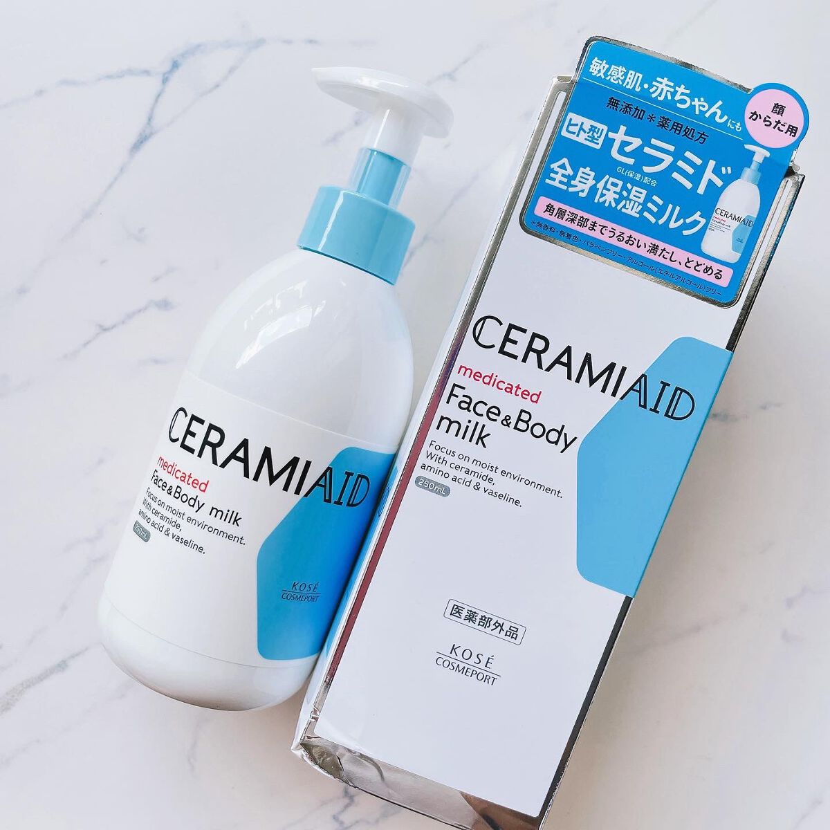 セラミドエイド 薬用スキンミルクは、人が作り出すセラミドと同じ構造をしたヒト型セラミドが肌のバリア機能を補ってくれるボディミルク♪ 無添加の医薬部外品だから赤ちゃんでも使えるくらいやさしい使用感なんだよ👶🤍 ぬれた肌にも使えるからお風呂上がりにささっと塗れちゃうところもお気に入り☺️
