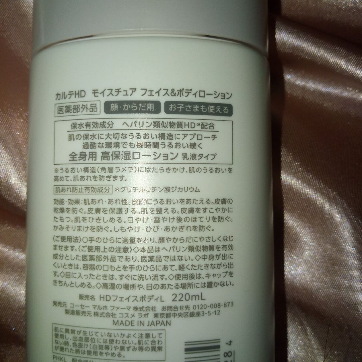 - 【高保湿フェイス&ボディローション】 顔にもからだにも。しっとりやわらか肌つづく。 信頼の保水有効成分「ヘパリン類似物質HD※」配合、低刺激処方の高機能フェイス&ボディローションです。 ヘパリン類似物質HDが、気温・湿度の変化で乾燥しやすいからだの肌のうるおい構造(角層ラメラ)を立て直し、しっとりやわらか肌に導きます。 2種のこだわりオイル配合で、しっとりするのにべたつかず、なめらかにのびひろがる使用感。敏感な肌でもまさつによるストレスがなく、全身をうるおいで満たします。 カルテHDシリーズとしては初めてお子さま(3歳以上)にもお使いいただける商品。 ・ボトルタイプ(220mL) ・ポンプタイプ(410mL) ・つめかえ用(370mL)の3種でラインアップ。 ご自身の保湿に、ご家族や大切なかたの保湿に。みずみずしくなめらかなうるおいが全身を包み込むフェイス&ボディローションです。 ※保水有効成分ヘパリン類似物質のこと <販売名:HD フェイスボディL>