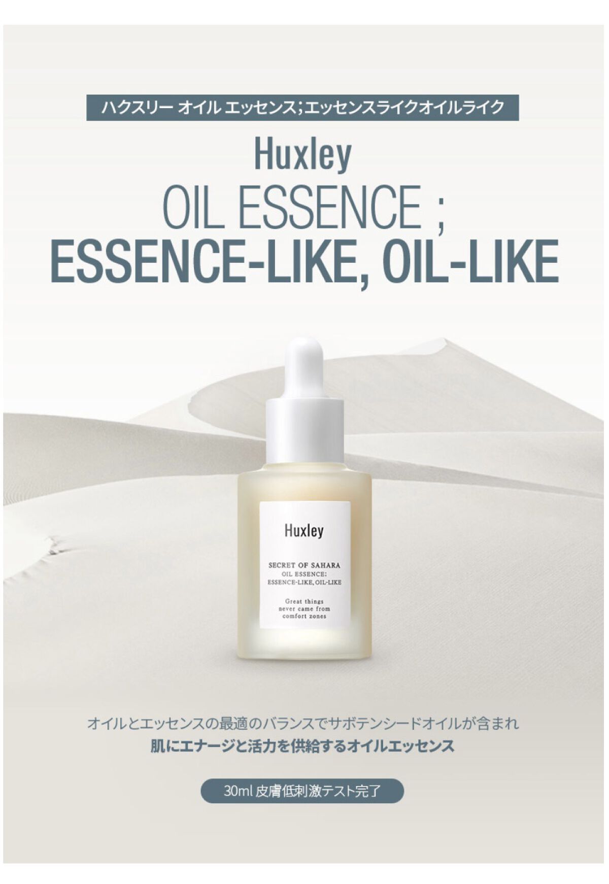 Huxleyオイルエッセンス;エッセンスライクオイルライクオイルとエッセンスをバランスよく配合したハイブリッド美容液!オイルの高い保湿力とエッセンスの浸透力・栄養分を兼ね備え、ベタつかず軽い仕上がりが魅力のアイテムです。化粧水で肌を整えた後ス...