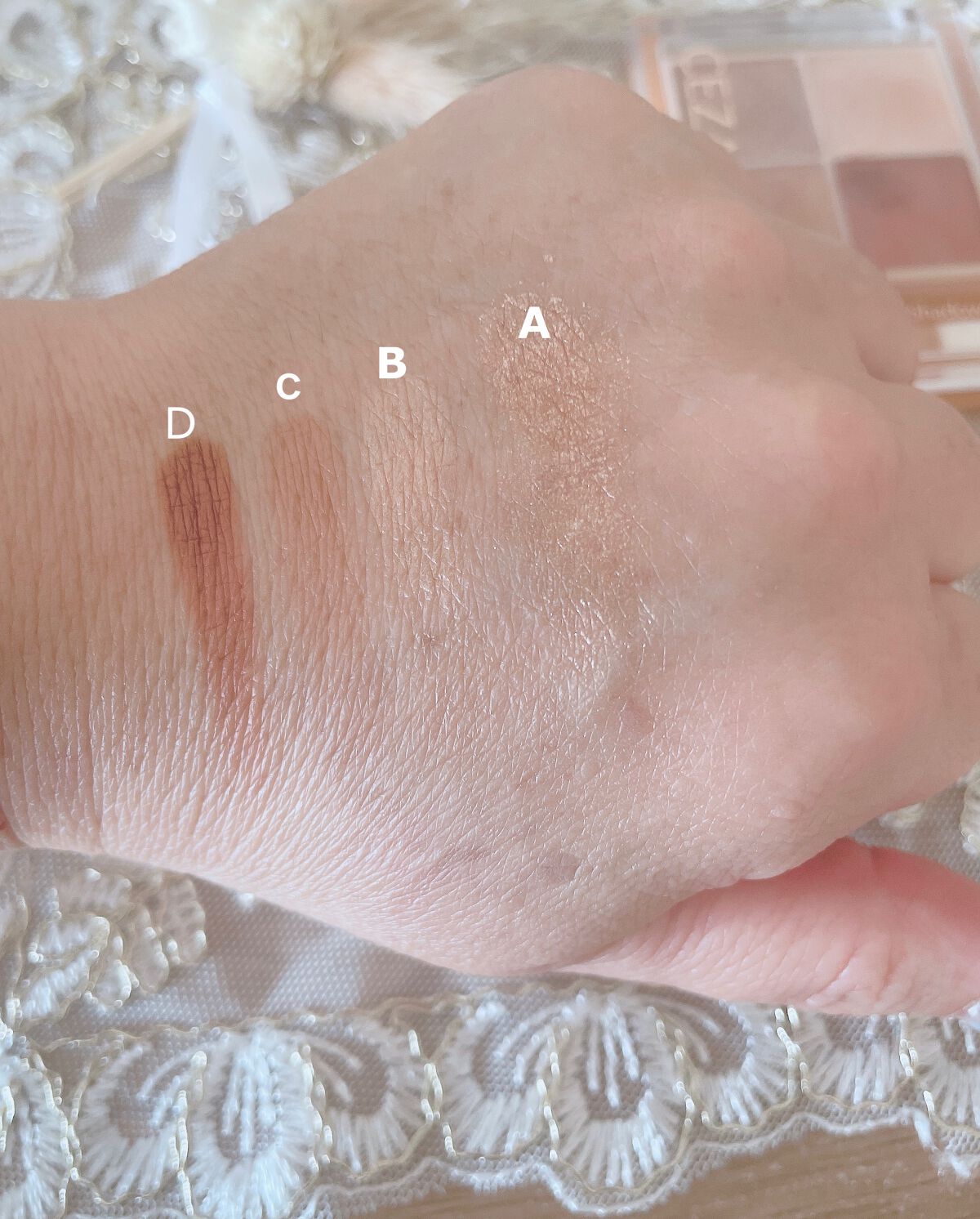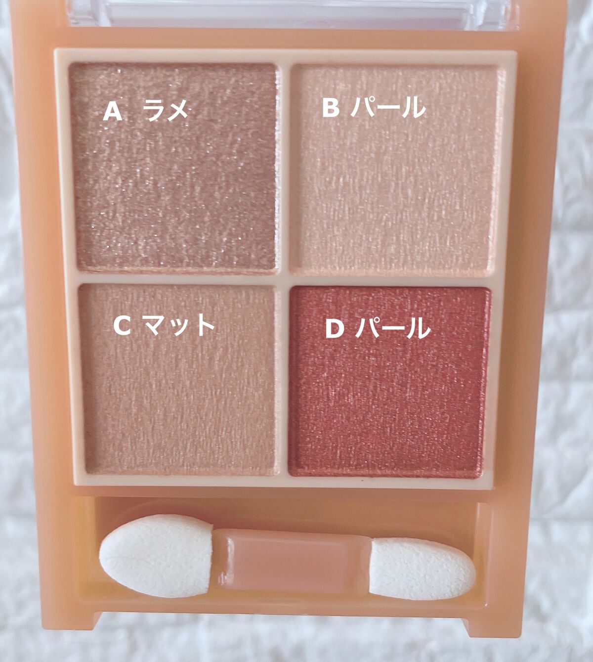 - ラメ・パール・マット3質感の4色アイシャドウ。 肌馴染みの良いベージュを基調としたカラー。ラメ・パール・マットの3質感を重ねて、自然にまぶたを強調し奥行のある大きな目元へ。 しっとり溶け込むような柔らかなパウダーなので、スルスル伸びてまぶたにピタッと密着。保湿成分(スクワラン・ホホバ種子油)配合。