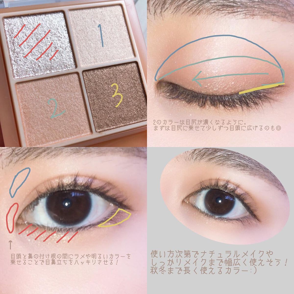 - ラメ・パール・マット3質感の4色アイシャドウ。 肌馴染みの良いベージュを基調としたカラー。ラメ・パール・マットの3質感を重ねて、自然にまぶたを強調し奥行のある大きな目元へ。 しっとり溶け込むような柔らかなパウダーなので、スルスル伸びてまぶたにピタッと密着。保湿成分(スクワラン・ホホバ種子油)配合。