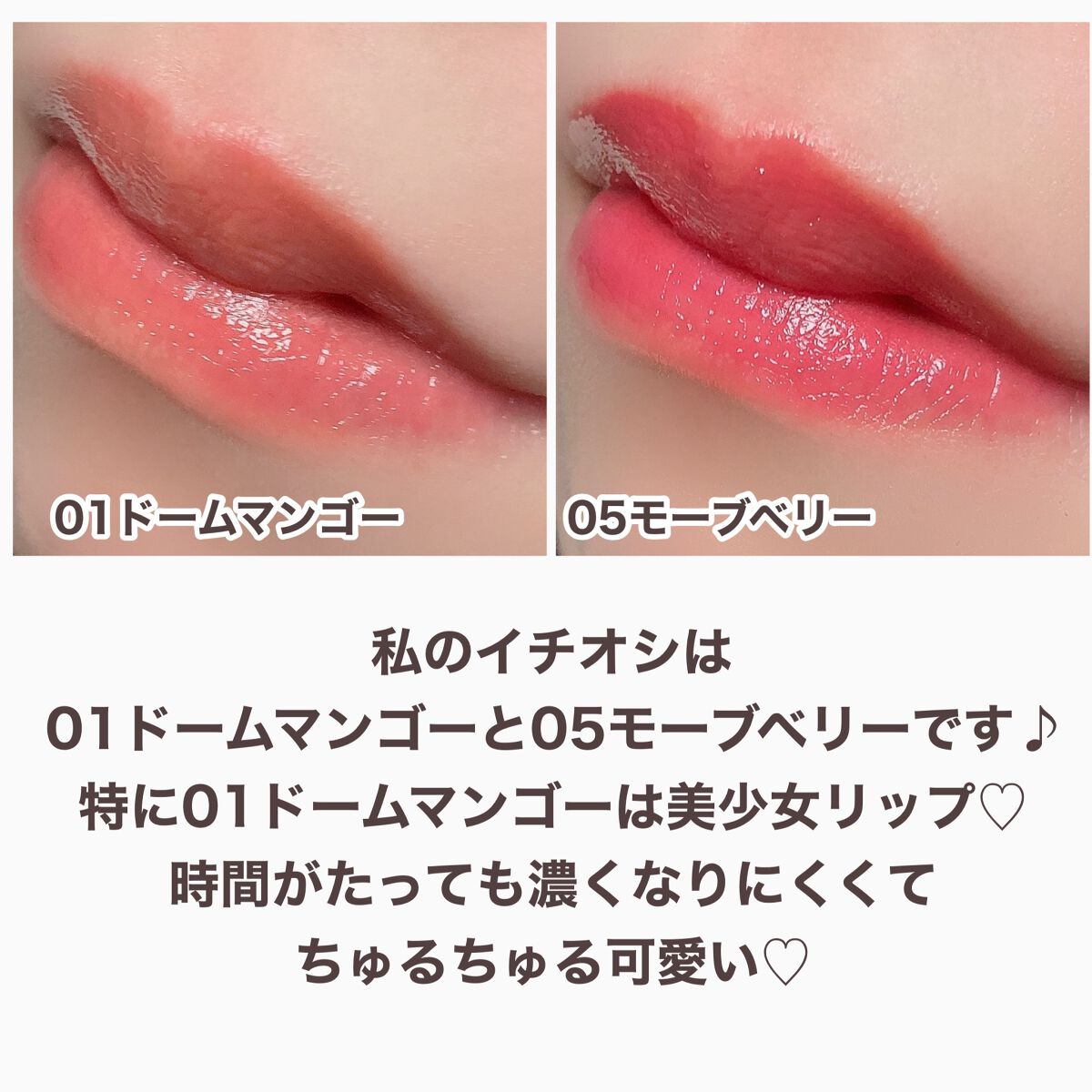 - <01 ムードマンゴー> 水、ジフェニルジメチコン、リンゴ酸ジイソステアリル、ビスジグリセリルポリアシルアジペート-2、ジグリセリン、水添ポリイソブテン、ダイマージリノール酸(フィトステリル/イソステアリル/セチル/ステアリル/ベヘニル)、ポリソルベート60、セチルPEG/PPG-10/1ジメチコン、DPG、ポリフェニルシルセスキオキサン、イソステアリン酸ソルビタン、ダイマージリノール酸ジイソステアリン酸ポリグリセリル-3、1,2-ヘキサンジオール、オクチルドデカノール、トリ(カプリル酸/カプリン酸)グリセリル、(アクリル酸ヒドロキシエチル/アクリロイルジメチルタウリンNa)コポリマー、セテアリルアルコール、酸化チタン、スクワラン、フェノキシエタノール、赤102、安息香酸ベンジル、エチルヘキシルグリセリン、黄4、香料、赤104(1)、水酸化Al、黄5、ポリアクリル酸アンモニウム、リナロール、BG、青1、塩化Na、ヘキシルシンナマル、トコフェロール <02 メロンシャーベット> 水、ジフェニルジメチコン、リンゴ酸ジイソステアリル、ビスジグリセリルポリアシルアジペート-2、ジグリセリン、水添ポリイソブテン、ダイマージリノール酸(フィトステリル/イソステアリル/セチル/ステアリル/ベヘニル)、ポリソルベート60、セチルPEG/PPG-10/1ジメチコン、DPG、ポリフェニルシルセスキオキサン、イソステアリン酸ソルビタン、ダイマージリノール酸ジイソステアリン酸ポリグリセリル-3、1,2-ヘキサンジオール、オクチルドデカノール、トリ(カプリル酸/カプリン酸)グリセリル、酸化チタン、(アクリル酸ヒドロキシエチル/アクリロイルジメチルタウリンNa)コポリマー、セテアリルアルコール、スクワラン、フェノキシエタノール、赤102、黄4、安息香酸ベンジル、エチルヘキシルグリセリン、赤104(1)、香料、水酸化Al、ポリアクリル酸アンモニウム、赤227、リナロール、BG、塩化Na、ヘキシルシンナマル、トコフェロール <03 ピンクグアバ> 水、ジフェニルジメチコン、リンゴ酸ジイソステアリル、ビスジグリセリルポリアシルアジペート-2、ジグリセリン、水添ポリイソブテン、ダイマージリノール酸(フィトステリル/イソステアリル/セチル/ステアリル/ベヘニル)、ポリソルベート60、セチルPEG/PPG-10/1ジメチコン、DPG、ポリフェニルシルセスキオキサン、イソステアリン酸ソルビタン、ダイマージリノール酸ジイソステアリン酸ポリグリセリル-3、1,2-ヘキサンジオール、オクチルドデカノール、トリ(カプリル酸/カプリン酸)グリセリル、(アクリル酸ヒドロキシエチル/アクリロイルジメチルタウリンNa)コポリマー、セテアリルアルコール、スクワラン、フェノキシエタノール、酸化チタン、赤104(1)、安息香酸ベンジル、エチルヘキシルグリセリン、黄5、香料、水酸化Al、ポリアクリル酸アンモニウム、リナロール、赤227、BG、青1、ヘキシルシンナマル、トコフェロール <04 プラムデュー> 水、ジフェニルジメチコン、リンゴ酸ジイソステアリル、ビスジグリセリルポリアシルアジペート-2、ジグリセリン、水添ポリイソブテン、ダイマージリノール酸(フィトステリル/イソステアリル/セチル/ステアリル/ベヘニル)、ポリソルベート60、セチルPEG/PPG-10/1ジメチコン、DPG、ポリフェニルシルセスキオキサン、イソステアリン酸ソルビタン、ダイマージリノール酸ジイソステアリン酸ポリグリセリル-3、1,2-ヘキサンジオール、オクチルドデカノール、トリ(カプリル酸/カプリン酸)グリセリル、(アクリル酸ヒドロキシエチル/アクリロイルジメチルタウリンNa)コポリマー、セテアリルアルコール、酸化チタン、スクワラン、フェノキシエタノール、赤104(1)、黄5、赤227、安息香酸ベンジル、エチルヘキシルグリセリン、香料、黄4、水酸化Al、ポリアクリル酸アンモニウム、リナロール、BG、ヘキシルシンナマル、塩化Na、トコフェロール <05 モーブベリー> 水、ジフェニルジメチコン、リンゴ酸ジイソステアリル、ビスジグリセリルポリアシルアジペート-2、ジグリセリン、水添ポリイソブテン、ダイマージリノール酸(フィトステリル/イソステアリル/セチル/ステアリル/ベヘニル)、ポリソルベート60、セチルPEG/PPG-10/1ジメチコン、DPG、ポリフェニルシルセスキオキサン、イソステアリン酸ソルビタン、ダイマージリノール酸ジイソステアリン酸ポリグリセリル-3、1,2-ヘキサンジオール、オクチルドデカノール、トリ(カプリル酸/カプリン酸)グリセリル、(アクリル酸ヒドロキシエチル/アクリロイルジメチルタウリンNa)コポリマー、セテアリルアルコール、酸化チタン、スクワラン、フェノキシエタノール、赤227、黄5、安息香酸ベンジル、エチルヘキシルグリセリン、香料、水酸化Al、ポリアクリル酸アンモニウム、リナロール、黄4、BG、ヘキシルシンナマル、塩化Na、トコフェロール <06 ローズアップル> 水、ジフェニルジメチコン、リンゴ酸ジイソステアリル、ビスジグリセリルポリアシルアジペート-2、ジグリセリン、水添ポリイソブテン、ダイマージリノー