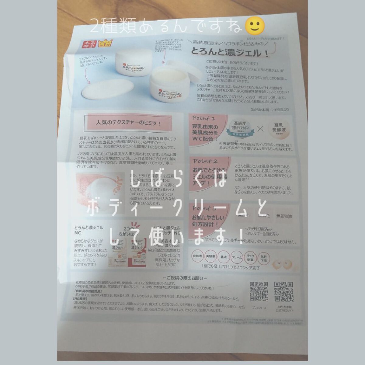 - 「なめらか本舗」のとろんと濃ジェルが世界新開発※1の成分「高純度豆乳イソフラボン※2」を配合してリニューアル!1個で6役、ぷるんとすべすべの絹ごし肌へ。 【おすすめポイント】 1.豆乳発酵液※2に加え、高純度豆乳イソフラボン※2を新配合✨豆乳由来の保湿成分をWで配合し、もっとなめらか美肌に🎵 2.温度依存性のある形態記憶ジェルがとろけるようになじみ、お肌にぐんぐん浸透※3!べたつかず、使用感もアップ🌟 "とろんと濃い形態記憶ジェル" 豆乳ににがりを加えると固まるのは、イオンの力のおかげ。とろんと濃ジェルのとろんと感も、イオンの力を利用しています。 3."化粧水・美容液・乳液・クリーム・パック効果・化粧下地" の6役がこれひとつでOK!忙しい朝にもぴったりです。 ※1 化粧品原料として世界で初めてINCI名(国際化粧品表示名称)を取得しました ※2 保湿成分 ※3 角層まで
