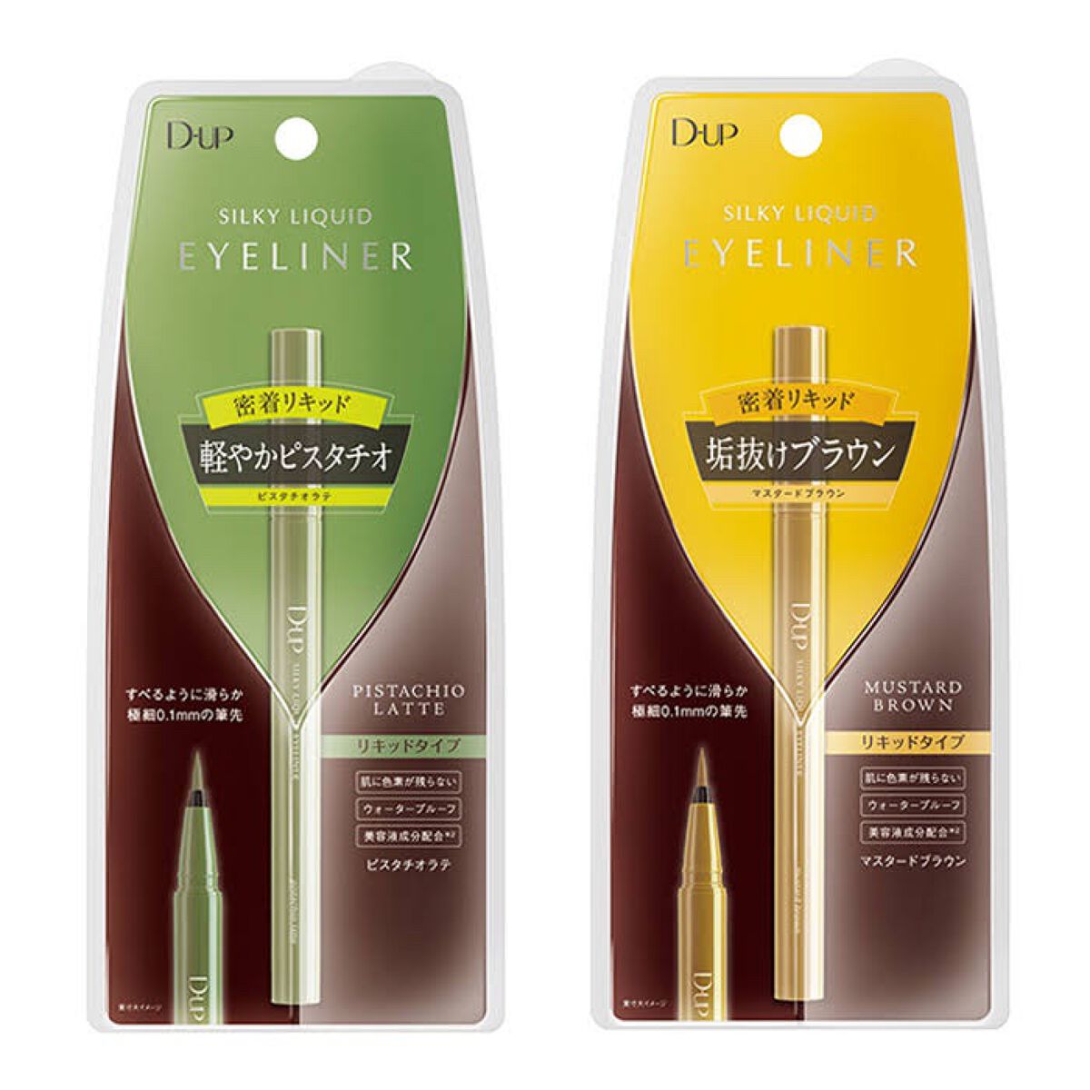 - 筆先までずっとなめらか、目尻で感動するリキッドアイライナー。 必要な量が肌にのる新設計で、まぶたの上をすべるような、滑らかな描き心地。しなやかでコシのある筆が、筆圧のコントロールを容易にし、太いラインも細いラインも思い通りに仕上げます。水、汗、涙に強いウォータープルーフタイプなのに、通常洗顔で簡単オフ。肌に色素が残らない顔料を使用。5種類の美容液成分を従来品の200%配合し、メイクしながら目元ケアまで。 ●ブラウンブラック ※2020年9月12日 バラエティショップ先行発売 ●漆黒ブラック ※2020年12月頃発売予定 ●ナチュラルブラウン ※2020年12月頃発売予定 ●シフォンブラウン 「毎日メイクに透明感と抜け感」 ブラウンでも、グレーでも、ベージュでもないニュアンスカラー。 自然な印影で素の目元を際立て、頑張りすぎない、ふんわりとした目元に。 ●アプリコットブラウン 「じゅわっと血色感。 肌に馴染むおしゃれカラー」 温かみのあるアプリコットがじゅわっと滲む血色感を目元に演出。 肌馴染みが良いので、カラーライナーに抵抗がある方もブラウンの延長線上で楽しめる、使いやすい色味です。 ”ちょっとオシャレ”な空気感を演出するカラー。 ●ピンクショコラ アイライナー 「ピンクが溶け込む濃厚ブラウン」 肌馴染みが良く、目元にじんわり血色感をプラス。 さりげなく女性らしさが加速するようなカラー。 ●ピスタチオラテ (2022年7月29日(金)発売) 「“目尻”に抜け感アクセント」 肌に馴染むのに映える絶妙なグリーン。 トレンドカラーに“くすみ”と“抜け感”をプラスしたまろやかな発色。 ●マスタードブラウン 「“イエロー”が揺れる、大人の洒落色」 (2022年7月29日(金)発売) まるで太陽のような暖かさを感じる新しいブラウン。 ほんのり感じるイエローでメイクが一気に垢抜ける稀有な色。 ●シフォンピンク(2023年2月10日発売) 「ふんわり柔らか"まろみピンク"」 甘くなりすぎない青みニュアンスで目元の透明感UP。 目元を引き締め、ピンクメイクにありがちな腫れぼったさを解消。 ●ミルクカプチーノ(2023年4月21日発売) まろやかな深みの“優しい締め色” どんなメイクにも合わせやすいカラー。 自然な陰影でさりげなく目幅を拡張します。 ●グレーカシミア(2023年10月1日発売) ブラウンがほんのり溶け込んだ、暖色グレー まろやかな発色で、パーソナルカラーを問わず肌に馴染む 目元の陰影になりすまし、抜け感と目力を欲張りに叶える ●ダークフィグ(2024年6月1日発売) するする”なめらか。描きやすいのに、落ちにくい。 クッキリ可愛いほの甘ダークブラウン ●ピーチモカ(2024年8月1日発売) ふわっと自然に盛れる“桃色ブラウン” ほんのり血色感で目元にうるみ感を演出 ●スターダストブラウン(2024年12月11日発売) キラッと繊細に輝く''星屑ブラウン'' 透け感のあるダークブラウンの色味とラメの輝きが、目元に艶のある立体感を演出 ●チャコールモカ(2025年4月10日発売) 目元を締める''深みグレージュ'' 黄みや赤みに偏りすぎない絶妙な色設計で、自然に目元を強調