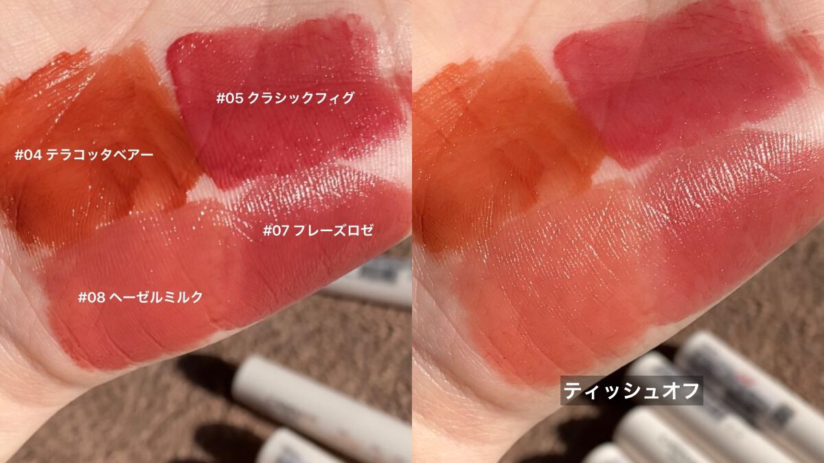 - <01 アンティークローズ> 水添ポリイソブテン、水、オクチルドデカノール、BG、エタノール、グリセリン、セテアリルアルコール、イソステアリン酸PEG-60グリセリル、ステアリン酸グリセリル、(アクリル酸ヒドロキシエチル/アクリロイルジメチルタウリンNa)コポリマー、フェノキシエタノール、ジメチコン、クエン酸Na、トコフェロール、水酸化Al、クエン酸、ジフェニルシロキシフェニルトリメチコン、スクワラン、ホホバ種子油、ヒアルロン酸Na、硫酸Ba、加水分解コラーゲン、セラミドNP、ソメイヨシノ葉エキス、カミツレ花エキス、酸化チタン、酸化鉄、黄4、赤227、赤104(1)、赤226、青1、グンジョウ <05 クラシックフィグ > 水添ポリイソブテン、水、オクチルドデカノール、BG、エタノール、グリセリン、パルミチン酸エチルヘキシル、セテアリルアルコール、イソステアリン酸PEG-60グリセリル、ステアリン酸グリセリル、(アクリル酸ヒドロキシエチル/アクリロイルジメチルタウリンNa)コポリマー、フェノキシエタノール、ジメチコン、クエン酸Na、トコフェロール、水酸化Al、クエン酸、ジフェニルシロキシフェニルトリメチコン、スクワラン、ホホバ種子油、ヒアルロン酸Na、硫酸Ba、加水分解コラーゲン、セラミドNP、ソメイヨシノ葉エキス、カミツレ花エキス、酸化チタン、酸化鉄、黄4、赤227、赤226、青1