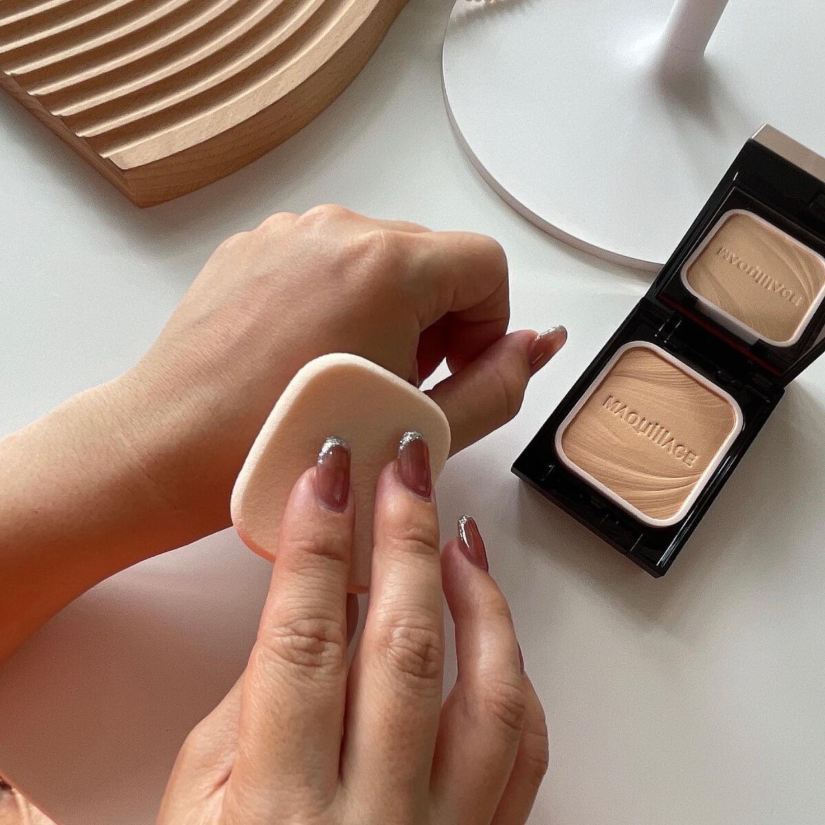 ふんわりとした仕上がりながら自然なツヤ感を演出するパウダーファンデ◎ 資生堂独自の「ムースプレス製法」により、美容液水とパウダーをムース状にして固めた軽やかなテクスチャーが特徴です。 肌に溶け込むようななめらかなフィット感で、毛穴や色ムラをふんわりとカバーしてくれる感じ。