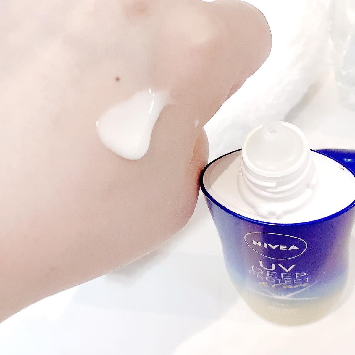 ニベアUVディーププロテクト&ケアジェル顔&身体の全身に使えます✨SPF50+/PA++++日やけによるシミ、そばかすを予防...加えて美容ケアまで👍汗・水に強いスーパーウォータープルーフ👍早速、使ってみると.....適量を手に取りまんべん無...