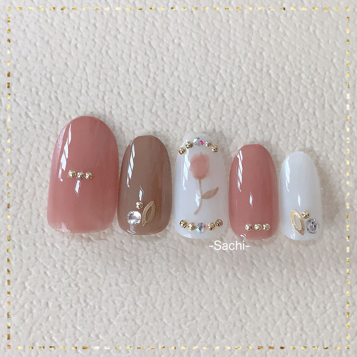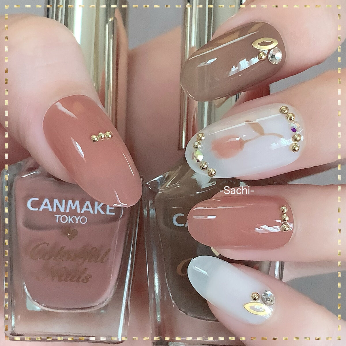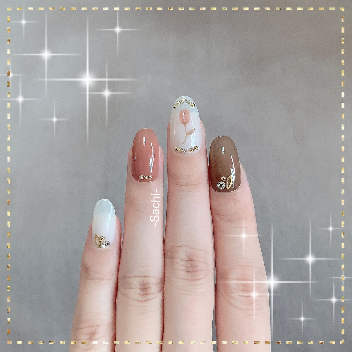 ワンカラーでも指ごとに色を変えるだけでオシャレに見えます💕 画像のようにゴールドラインとストーンを少し足すだけで華やかさがアップ🥰 何度かご紹介したことのあるスポンジで作るグラデーションです✨ スポンジを使うことで境目が綺麗に馴染んでくれます💕 アルミホイルの上でブラウンとトップコートを1:1くらいで混ぜたものを、トップコートのハケに取って3箇所に塗るだけ👌 事前に混ぜたものを塗ることで、爪の上でぼかすより簡単に出来ます💕 ベースカラーが乾く前に点置きしてぼかすことで綺麗にぼかせます✨ スピードが大事なので、使うポリッシュのキャップは全て開けておきましょう😊 天然石のラインはガタガタの方がより天然石っぽく見えるので、ラインを描くのが苦手な方でも大丈夫🙆♀️ 難しそうに見えて、やってみると意外と簡単に出来ます♡