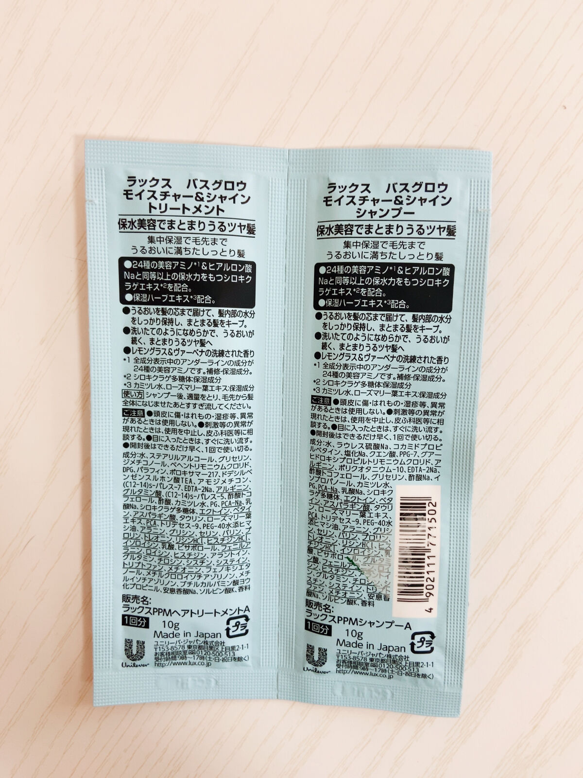 - <シャンプー ポンプ> 水、ラウレス硫酸Na、コカミドプロピルベタイン、塩化Na、クエン酸、PPG-7、グアーヒドロキシプロピルトリモニウムクロリド、アルギニン、ポリクオタニウム-10、EDTA-2Na、酢酸トコフェロール、酢酸Na、イソプロパノール、グリセリン、PCA-Na、乳酸Na、シロキクラゲ多糖体、エクトイン、ベタイン、アスパラギン酸、タウリン、PCA、アラニン、グリシン、セリン、キサンタンガム、加水分解パール、バリン、プロリン、トレオニン、リシンHCl、ヒスチジンHCl、イソロイシン、乳酸、グルタミン酸、フェニルアラニン、ロイシン、ヒスチジン、アラントイン、グルタミン、チロシン、シスチン、システイン、トリプトファン、メチオニン、安息香酸Na、ソルビン酸K、香料 <トリートメント ポンプ> 水、ステアリルアルコール、グリセリン、ジメチコノール、ベヘントリモニウムクロリド、DPG、パラフィン、ポロキサマー217、ドデシルベンゼンスルホン酸TEA、アモジメチコン、(C12-14)s-パレス-7、EDTA-2Na、アルギニン、グルタミン酸、(C12-14)s-パレス-5、酢酸トコフェロール、酢酸、PCA-Na、乳酸Na、シロキクラゲ多糖体、エクトイン、ベタイン、アスパラギン酸、タウリン、PCA、アラニン、グリシン、セリン、キサンタンガム、加水分解パール、バリン、プロリン、トレオニン、リシンHCl、ヒスチジンHCl、イソロイシン、乳酸、フェニルアラニン、ロイシン、ヒスチジン、アラントイン、グルタミン、チロシン、シスチン、システイン、トリプトファン、メチオニン、フェノキシエタノール、メチルクロロイソチアゾリノン、メチルイソチアゾリノン、ブチルカルバミン酸ヨウ化プロピニル、安息香酸Na、ソルビン酸K、香料 <シャンプーつめかえ用> 水、ラウレス硫酸Na、コカミドプロピルベタイン、塩化Na、クエン酸、PPG-7、グアーヒドロキシプロピルトリモニウムクロリド、アルギニン、ポリクオタニウム-10、EDTA-2Na、酢酸トコフェロール、酢酸Na、イソプロパノール、グリセリン、PCA-Na、乳酸Na、シロキクラゲ多糖体、エクトイン、ベタイン、アスパラギン酸、タウリン、PCA、アラニン、グリシン、セリン、キサンタンガム、加水分解パール、バリン、プロリン、トレオニン、リシンHCl、ヒスチジンHCl、イソロイシン、乳酸、グルタミン酸、フェニルアラニン、ロイシン、ヒスチジン、アラントイン、グルタミン、チロシン、シスチン、システイン、トリプトファン、メチオニン、安息香酸Na、ソルビン酸K、香料 <トリートメントつめかえ用> 水、ステアリルアルコール、グリセリン、ジメチコノール、ベヘントリモニウムクロリド、DPG、パラフィン、ポロキサマー217、ドデシルベンゼンスルホン酸TEA、アモジメチコン、(C12-14)s-パレス-7、EDTA-2Na、アルギニン、グルタミン酸、(C12-14)s-パレス-5、酢酸トコフェロール、酢酸、PCA-Na、乳酸Na、シロキクラゲ多糖体、エクトイン、ベタイン、アスパラギン酸、タウリン、PCA、アラニン、グリシン、セリン、キサンタンガム、加水分解パール、バリン、プロリン、トレオニン、リシンHCl、ヒスチジンHCl、イソロイシン、乳酸、フェニルアラニン、ロイシン、ヒスチジン、アラントイン、グルタミン、チロシン、シスチン、システイン、トリプトファン、メチオニン、フェノキシエタノール、メチルクロロイソチアゾリノン、メチルイソチアゾリノン、ブチルカルバミン酸ヨウ化プロピニル、安息香酸Na、ソルビン酸K、香料