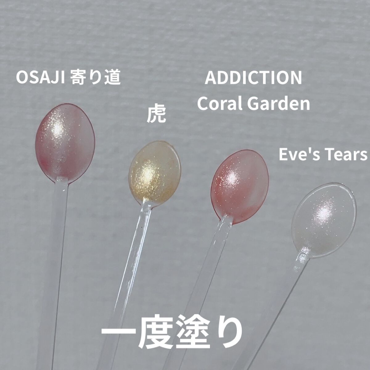 OSAJI『蜜』を2度塗り とにかく塗りやすい✨ 特に2度塗りだとムラなく綺麗に塗れます! 1度塗りの方が肌なじみは良い気がしました。 ブルベの方にも使いやすいブラウンだと思います🙌🏻 細かいラメがたくさん入っていて美しい❣️ 透明のベースにホログラムざくざく🌟 濃いめのカラーに乗せるとホロが目立ってかわいい🙆♀️ ホロが筆につきにくくてもうちょっとたくさん入ってればなぁと思ったので悩んでマイナス1。 でもかわいいので次は別の違う筆を使ってもっとぎっしり乗せてみたいと思います😙