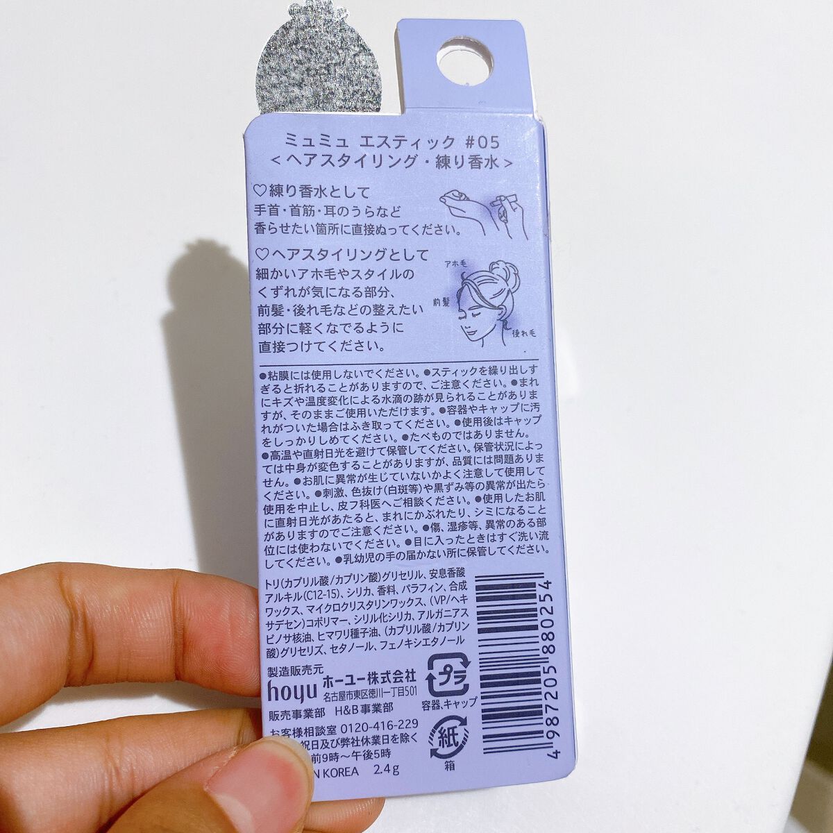 - 練り香水×まとめ髪・アホ毛スティック として使える リップ型マルチスティック POINT①まとめ髪スティックとして使える。 アホ毛、前髪、おくれ毛をしっかりまとめて弱点知らずのヘアスタイルをいつでもキープ。 しっかり直せるのにベタベタしない。 POINT②練り香水としてふんわり香る。 好きな香りをいつでもどこでも付け直せる。うるおい成分たっぷり。肌にも優しい。 香りはインフルエンサー100人が厳選した4種の香り。 POINT③コスメ感覚で持ち運べる。 リップ型だからポーチに入れても邪魔しない。ポーチの新たなレギュラーアイテムに。