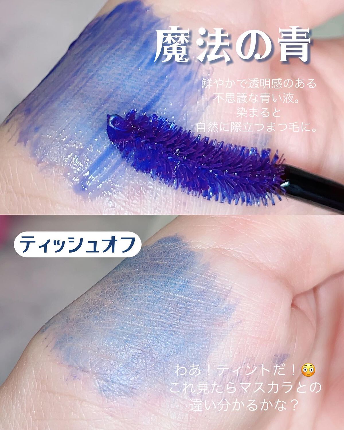 見えないまつ毛を染めて目力アップ、まつ毛ティントです💙 魔法の3days*で目力アップ!まつげの先端は透明で目に見えにくいため、“魔法の青”のラッシュティント成分でまつげを染めて驚きのすっぴん美ロングまつ毛に。 このティント効果がずっと持続はしないので1週間に1回ペース(連続3日間)で使用すると染まった効果が持続しやすいそうです👀💙