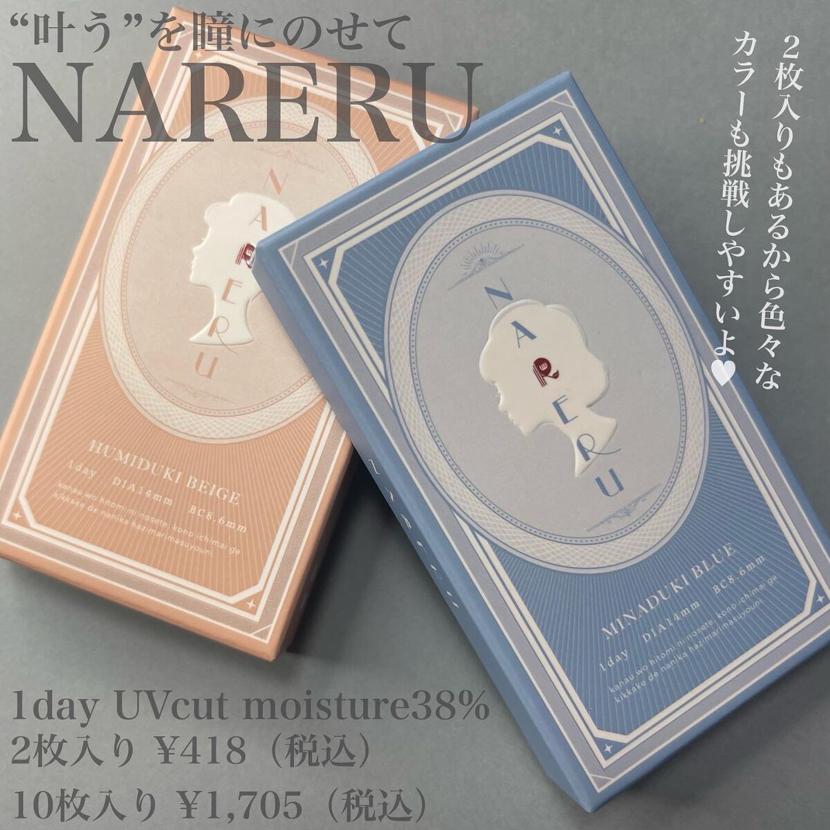 - 奥ゆかしくカラーを纏うNARERU(なれる)のレンズは、瞳の中で主張しすぎないのになんだか垢ぬけたような雰囲気になれるカラコン。 つけてわかるナチュラル感、黒髪にも浮かない、ひっそりと綺麗を叶えます。 ◎イメージモデル Z世代から絶大な支持を得るTikTokで人気の景井ひなさんがイメージモデルのカラコン。 ◎UV CUT シミ・シワ・たるみの原因となるUV-A派、眼障害の原因となるUV-B波をカット。 ※UVカット成分を配合したコンタクトレンズは、UVカットサングラスの代わりにはなりません。 ◎Wのうるおい成分配合 保存液にうるおい成分「MPCポリマー」を配合。涙を吸収しすぎることなくうるおいを保つ低含水レンズ。 ※装用感には個人差があります。 ◎選べる枚数 定番の10枚入りと、1回お試しするのにぴったりな2枚入りをご用意。 ※2枚入り、全色お試しセットはカラコン総合通販サイト<トゥインクルモール>のみ購入できます。 ◎カラーラインナップ レトロかわいい9色