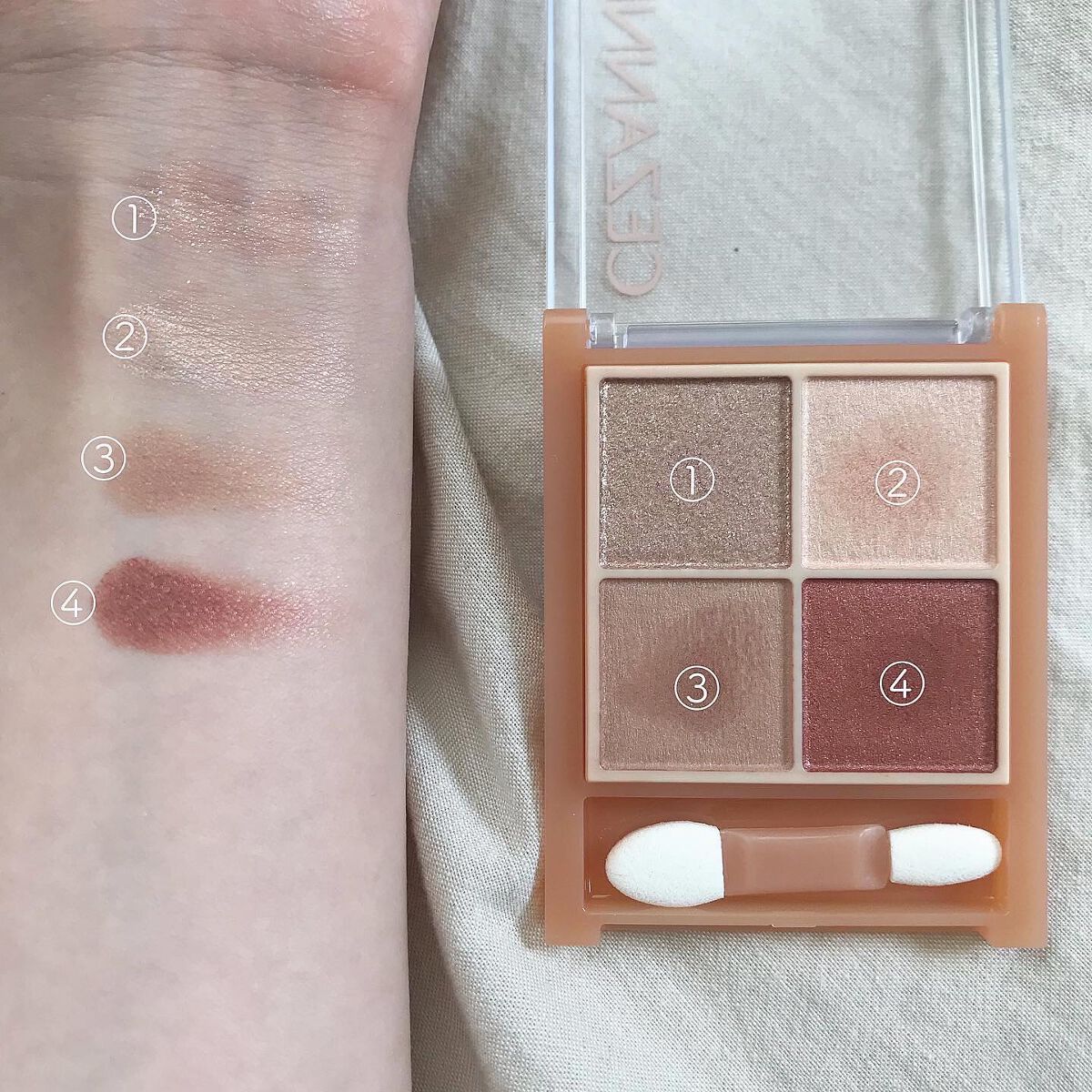 - ラメ・パール・マット3質感の4色アイシャドウ。 肌馴染みの良いベージュを基調としたカラー。ラメ・パール・マットの3質感を重ねて、自然にまぶたを強調し奥行のある大きな目元へ。 しっとり溶け込むような柔らかなパウダーなので、スルスル伸びてまぶたにピタッと密着。保湿成分(スクワラン・ホホバ種子油)配合。