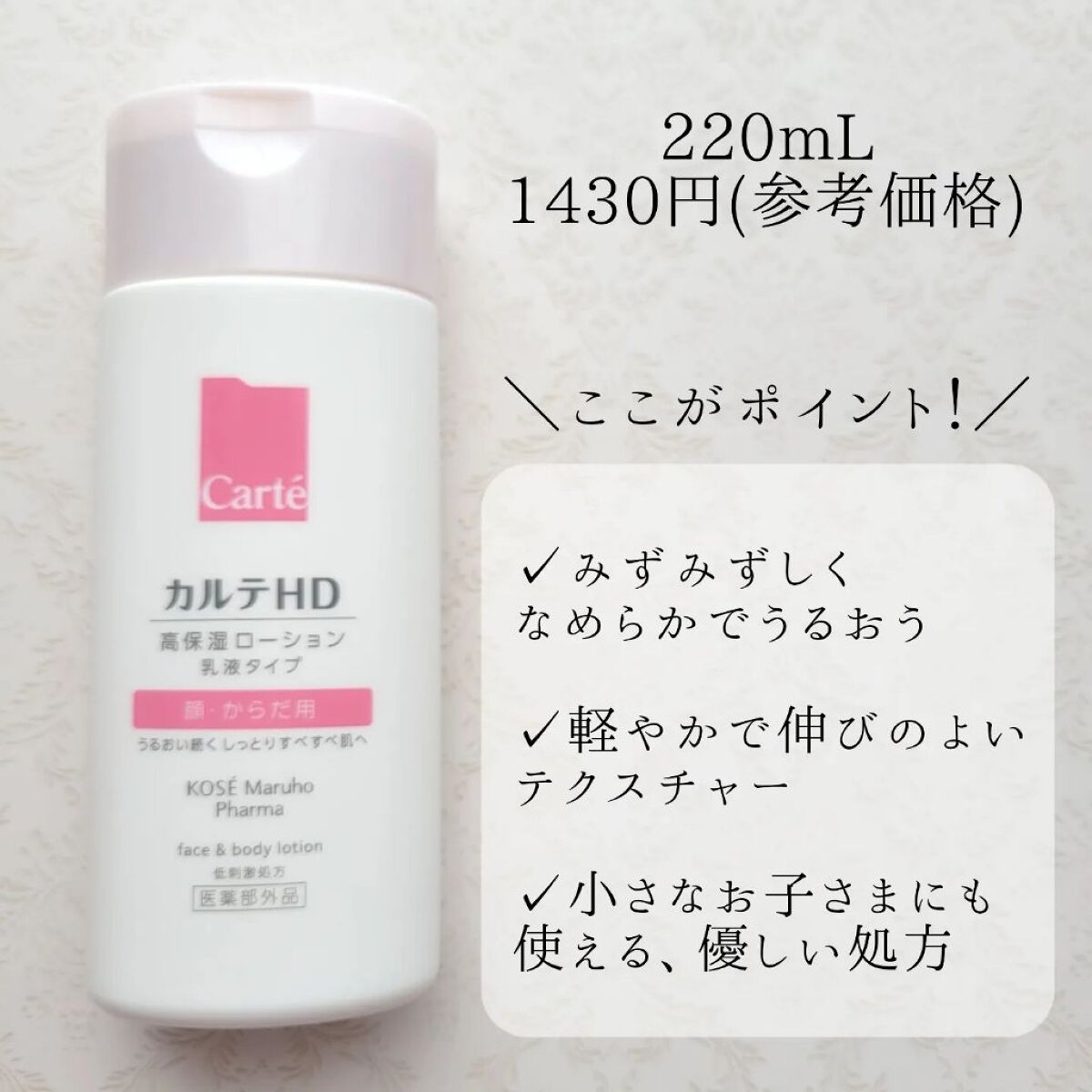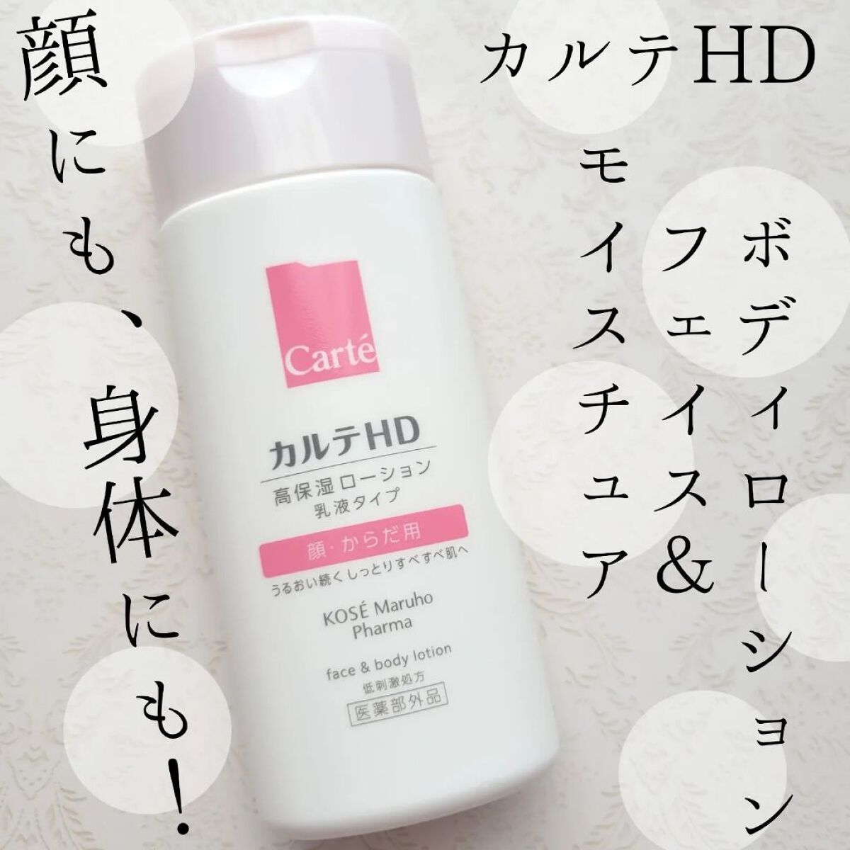 - 【高保湿フェイス&ボディローション】 顔にもからだにも。しっとりやわらか肌つづく。 信頼の保水有効成分「ヘパリン類似物質HD※」配合、低刺激処方の高機能フェイス&ボディローションです。 ヘパリン類似物質HDが、気温・湿度の変化で乾燥しやすいからだの肌のうるおい構造(角層ラメラ)を立て直し、しっとりやわらか肌に導きます。 2種のこだわりオイル配合で、しっとりするのにべたつかず、なめらかにのびひろがる使用感。敏感な肌でもまさつによるストレスがなく、全身をうるおいで満たします。 カルテHDシリーズとしては初めてお子さま(3歳以上)にもお使いいただける商品。 ・ボトルタイプ(220mL) ・ポンプタイプ(410mL) ・つめかえ用(370mL)の3種でラインアップ。 ご自身の保湿に、ご家族や大切なかたの保湿に。みずみずしくなめらかなうるおいが全身を包み込むフェイス&ボディローションです。 ※保水有効成分ヘパリン類似物質のこと <販売名:HD フェイスボディL>