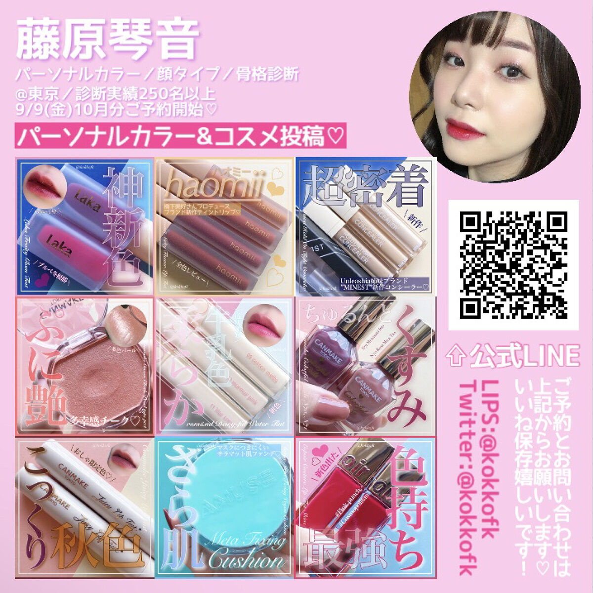 薄く唇に密着する新作マットティント。 マットなのにかなりしっとりとしていて 乾燥を感じなくてびっくりでした! 一気にこなれ感が出るトレンドカラーです♡ やや青みの華やかローズレッド 公式画像より鮮やかめに感じました。 やや黄みの強くて深いオレンジレッド ストロングオータムに超激推しです! やや黄みの非常に深く濃いダークブラウン ディープオータムに激推しです! かわいい雰囲気になれるピンクリップです♡ やや青みの柔らかいくすみピンクベージュ ミューテッドサマーにおすすめです! 青みの落ち着いたローズピンク やや青みのとても鮮やかなビビッドレッド ビビッドウィンターに特におすすめ! 既存マットティントよりもさらに ふわふわなマット感が魅力のリップで、 軽くティッシュオフしてもほとんど落ちない◎ マスクにも激推しのティントなので、 ぜひ皆さんもチェックしてみてね❤︎