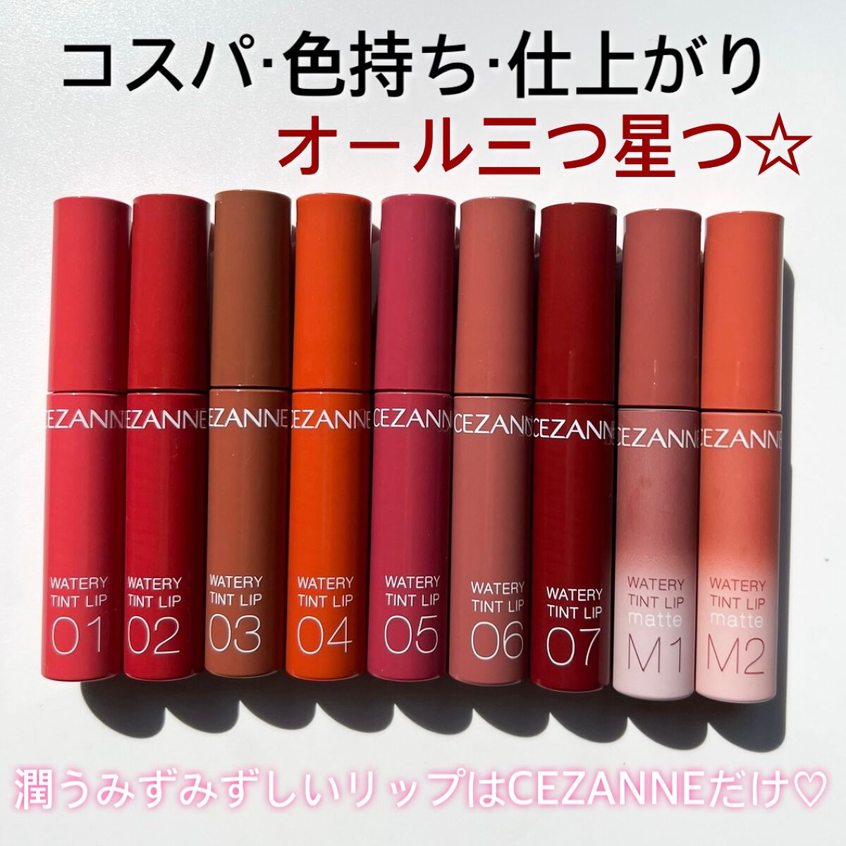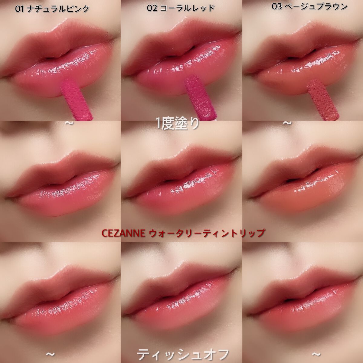 CEZANNEのウォータリーティントリップから新色が出た〜(*˘︶˘*).。.:*♡ということで全色スウォッチいってみたいと思います🙌🏻💕濡れたようなツヤが長時間持続するティントルージュ。水に濡れたような軽やかなツヤが持続✨唇に色がフィットし...