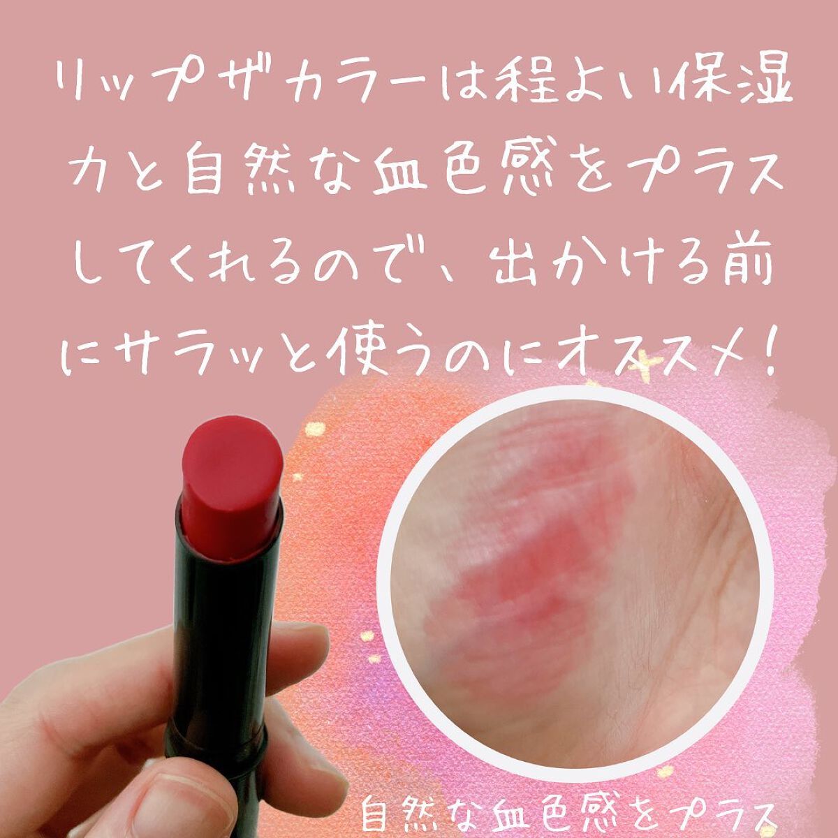 - 口紅よりもカジュアルなのに、色つきリップよりも色っぽい。 「リップザカラー」は、オイルティント処方を採用し、時間が経っても、唇の水分に反応することで発色が長続きする色つきリップです。こだわりの6種のトリートメントオイル*(保湿成分)とティント効果で、唇をプレミアムなうるおいで満たしながら、いつでも付けたてのような透明感があるキレイな発色を叶えます。UVカット(SPF26、PA+++)。無香料。自然な発色で、ナチュラルメイクにぴったり。 *:スクワランオイル(スクワラン)、ホホバオイル(ホホバ種子油)、アルガンオイル(アルガニアスピノサ核油)、アボカドオイル(水添アボカド油)、シアバター(シア脂)、オリーブオイル(オリーブ果実油)