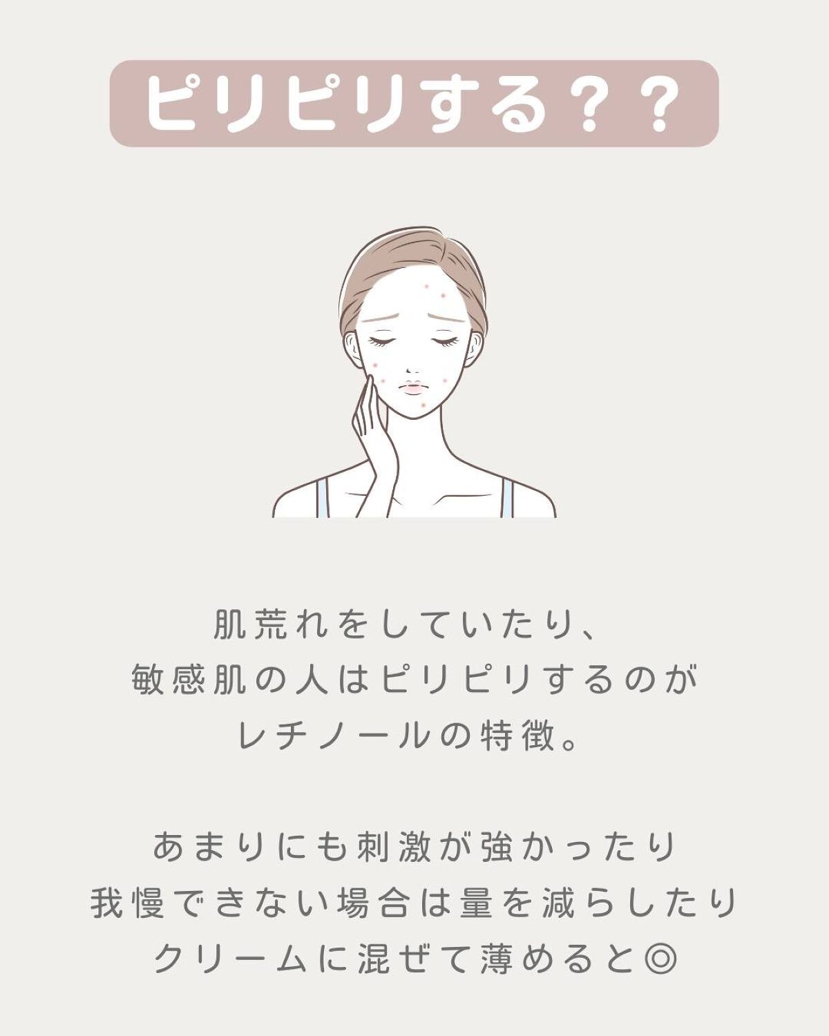私も最近購入して使ってるのですがレチノールのピリピリなのか、レチノール自体が駄目なのか違いが分かりません💦 1週間使い続けるとピリピリしなくなりますか?