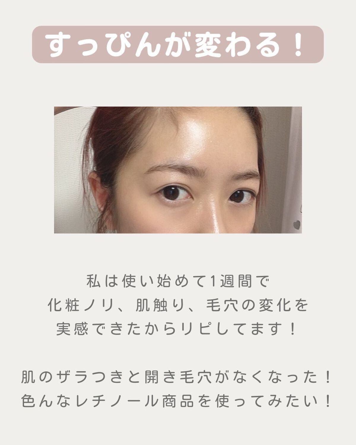 レチノールはビタミンAのことで、コラーゲン生成を促進:シワ・たるみ改善、肌のターンオーバー促進:シミ予防、皮脂分泌を抑える:毛穴閉じる、ニキビ改善の効果が得られるので、今話題になっています🌟 ただレチノール配合商品は濃度が異なっていて高濃度のものだとヒリヒリしてしまうことも😭 敏感肌さんや、肌荒れ中の方は要注意です! まずは低濃度のレチノールから始めるか週1回から様子を見て使い始めるのが◎ レチノールは紫外線に弱い成分です。必ず夜のスキンケアに取り入れましょう!