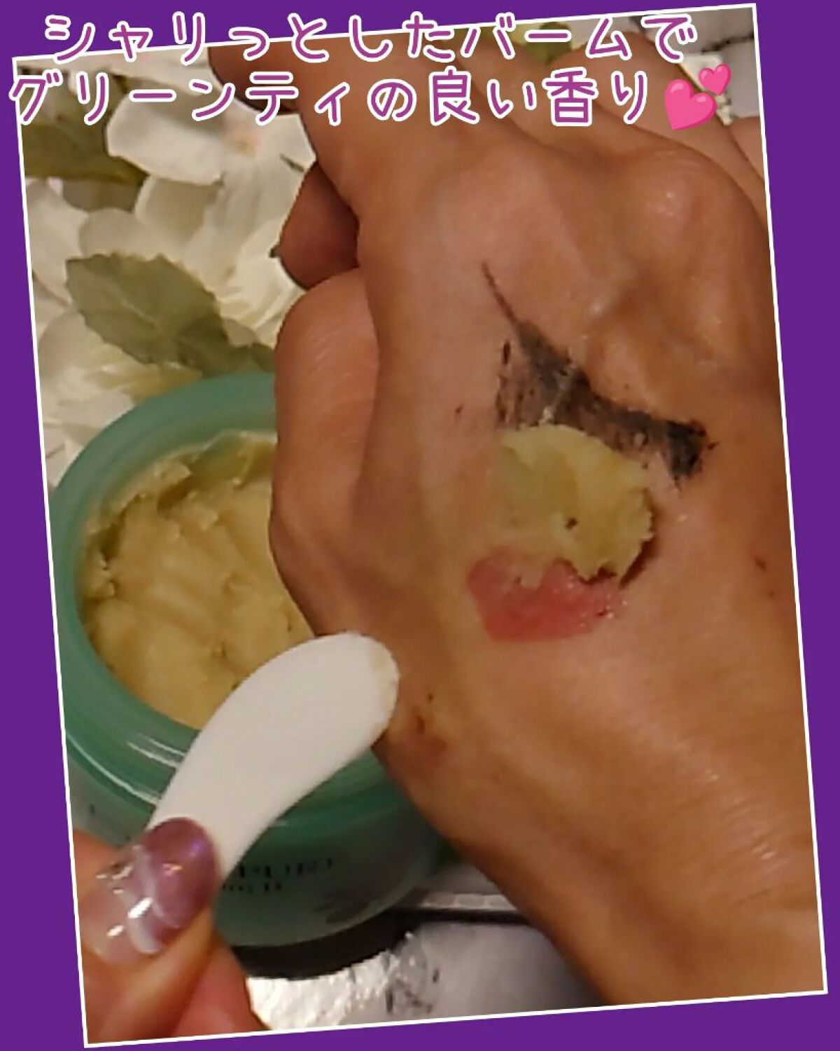 - 緑茶パウダー*とオイルバームテキスチャーが肌に刺激の少ない使い心地でしっかりクレンジング効果を与えてくれます。 *整肌成分