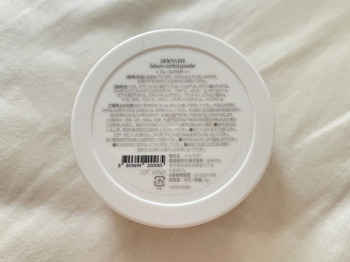 - シリカ,オクテニルコハク酸デンプンAl,トリ(カプリル酸/カプリン酸)グリセリル,(ジメチコン/ビニルジメチコン)クロスポリマー,ジメチコン,メチコン,フェノキシエタノール,カプリル酸グリセリル,エチルヘキシルグリセリン,アラントイン,ヒアルロン酸Na,マイカ,香料,リナロール,リモネン,ヒドロキシシトロネラール,シトロネロール,