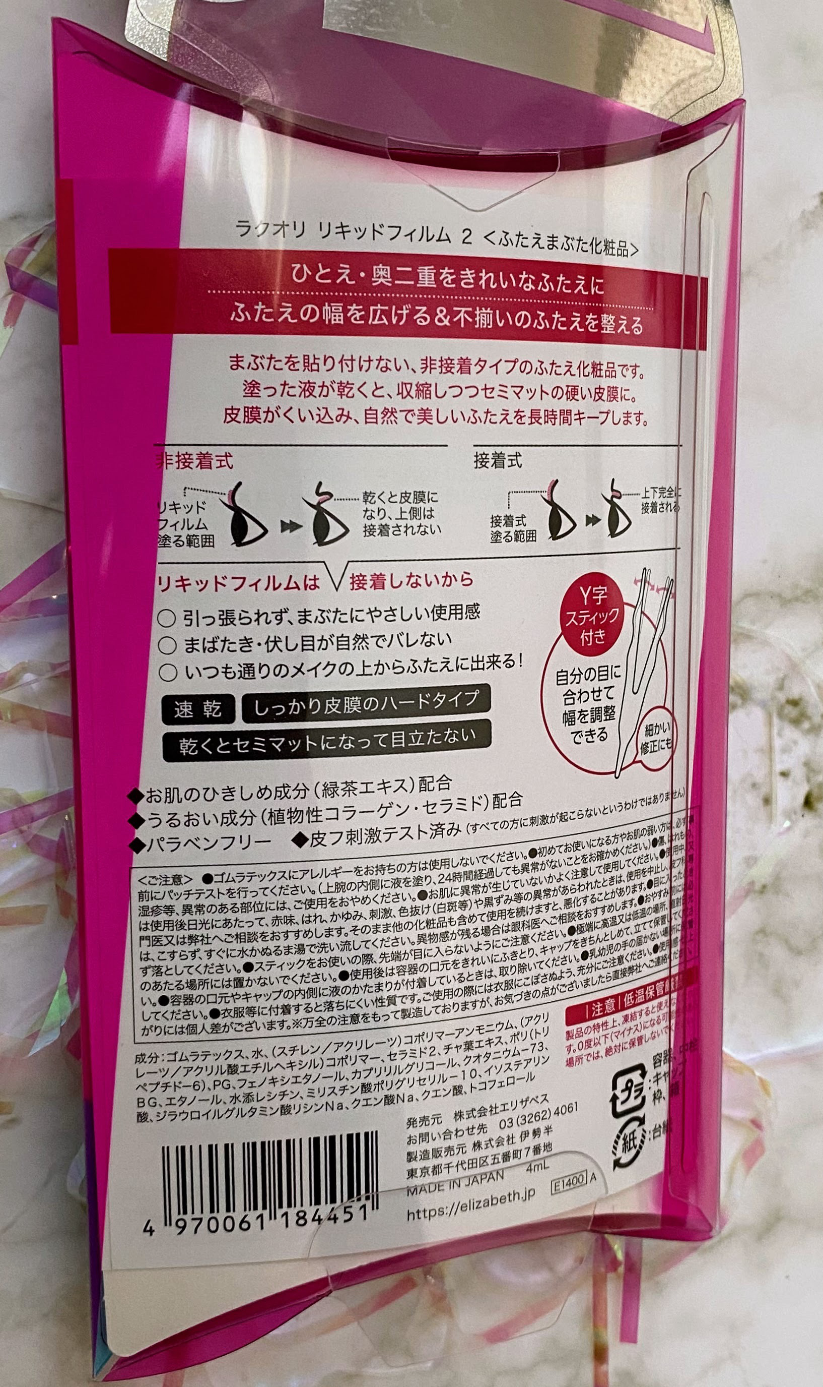 ラクオリ リキッドフィルム 2 シナモロールとのコラボパッケージ🐰 1,540円(税込) まぶたをくっつけないから、瞬きがラクで自然なのが良いなぁと思ったよ! お湯オフだよ!落としたいときはぬるま湯を含ませたコットンなどでふやかしてオフするだけだから簡単♪