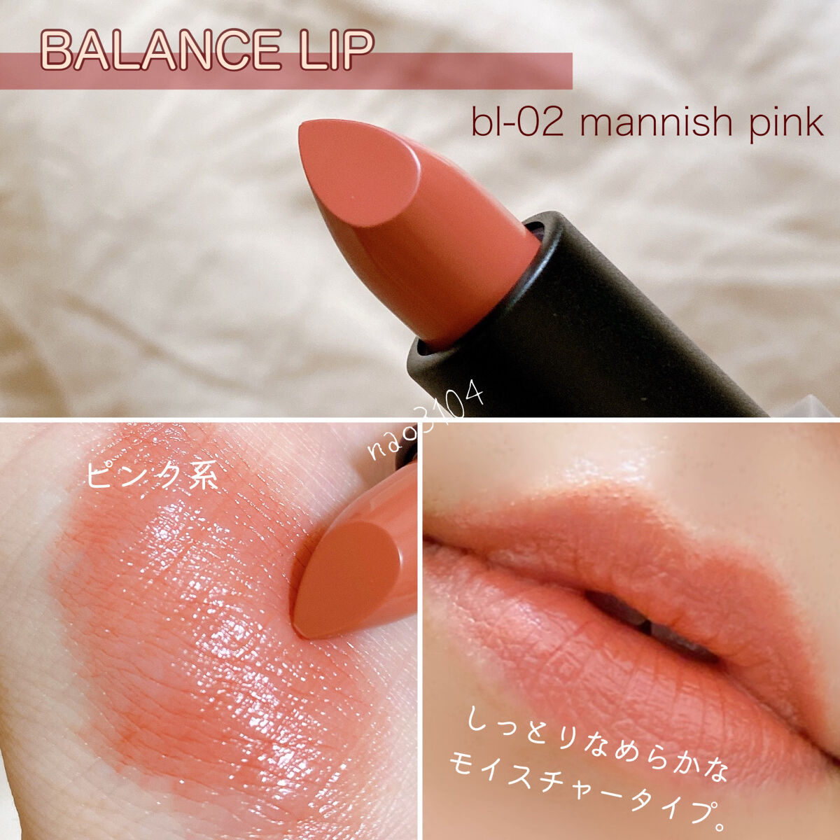 前回の全色スウォッチは #なおCHANEL 62よりも一見青み?灰み?が強いものの私でもなんなく使える馴染み色。 わずかにローズ感じるくすみピンク。ピンクリップが似合わない私ですがこれは挑戦したい!と思うオシャレな色。 ラックの中では数少ないコーラル。ついつい62番ばかり使ってしまいそうでしたが、PCスプリングを全面に演出したい時はこれ♪ 65より明度の高い限りなくピンク寄りのコーラル。手に出した時は蛍光っぽいなーと思ったけど、つけるとしっくり。この春らしい明るくて程よい黄みのある可愛い色です。 こちらも長期欠品していた人気色。ブラウンリップに挑戦したいけど、顔色悪くなっちゃう…とか、唇だけ目立っちゃう…って方にオススメしたい! 10月発売の新色。待っていたオレンジ系コーラル!個人的にはこのリップのシリーズで一番好き! こちらも10月発売の新色。82よりややしっかり発色で、秋冬にピッタリです。