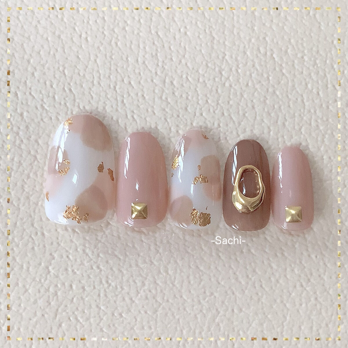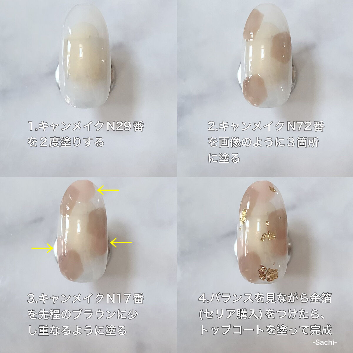 ワンカラーでも指ごとに色を変えるだけでオシャレに見えます💕 画像のようにゴールドラインとストーンを少し足すだけで華やかさがアップ🥰 何度かご紹介したことのあるスポンジで作るグラデーションです✨ スポンジを使うことで境目が綺麗に馴染んでくれます💕 アルミホイルの上でブラウンとトップコートを1:1くらいで混ぜたものを、トップコートのハケに取って3箇所に塗るだけ👌 事前に混ぜたものを塗ることで、爪の上でぼかすより簡単に出来ます💕 ベースカラーが乾く前に点置きしてぼかすことで綺麗にぼかせます✨ スピードが大事なので、使うポリッシュのキャップは全て開けておきましょう😊 天然石のラインはガタガタの方がより天然石っぽく見えるので、ラインを描くのが苦手な方でも大丈夫🙆♀️ 難しそうに見えて、やってみると意外と簡単に出来ます♡