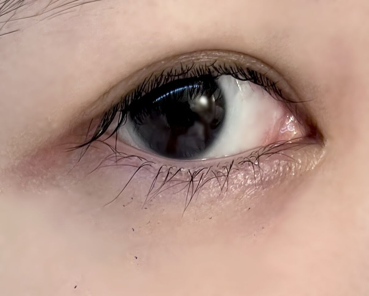 いつもとは違うまつ毛の長さは(特に矢印部分に)感じるけど、写真見た感じだとそんなでもないかな? 個人的にはあまり目立たなかったうぶ毛が強調されてまつ毛が増えたように感じる。 ウォータープルーフではないし、水で落ちたのでクレンジングとかはいらない。 ポロポロまぶたに着くし(画像参照)、すっぴん時敢えてビューラーはしないから液で上下のまつげが絡まる。 マスカラなしナチュラルメイクや、旅行でマスカラの工程省いたり、お泊まりとかですっぴん可愛い♡のために前もって仕込むのは結構アリかも。 あと、乾いてからまつ毛美容液塗ってもまつ毛ティントの色が移る。ティッシュで拭き取れば落ちるけど、毎回拭き取るのはなんか美容液がもったいない気もするし併用はできればしない方がいいんじゃないかな