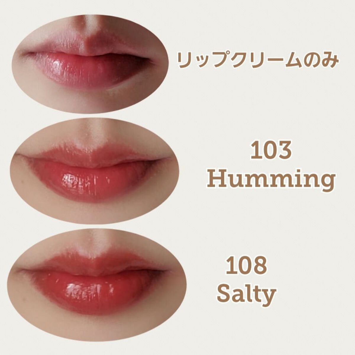 大人気なのが頷ける絶妙カラーと薄っすら膜が張ったようなツヤ感でめちゃくちゃ可愛い😍 103 Hummingはちょい黄み寄りピンクのナチュラルカラー ピーチミルクっぽい儚げ美少女感ある色🍑 割とニュートラルで誰でも日常使いしやすいと思いました。 108 Saltyはこなれベージュブラウン🦫 アップルブラウンと比べるとオレンジ感が少なく ティッシュオフするとより違いがはっきり分かります。 107Sugarと色は似てるのに砂糖と塩?って 迷いは深まったけどそんなに発色強くないので 思いの外ナチュラルで塩気強い感じではないです😳 落ち着いてるけど透け感もある色味なので顔色悪く 見えることもなくイエベは絶対お気に入りになる色🫶 香りはグリーンアップルみたいで今のところ 唇が荒れたりはしてないです。 1本の値段だと韓国ティントの中では少しお高めだけど それでも大人気なのが分かる良いリップでした☺️
