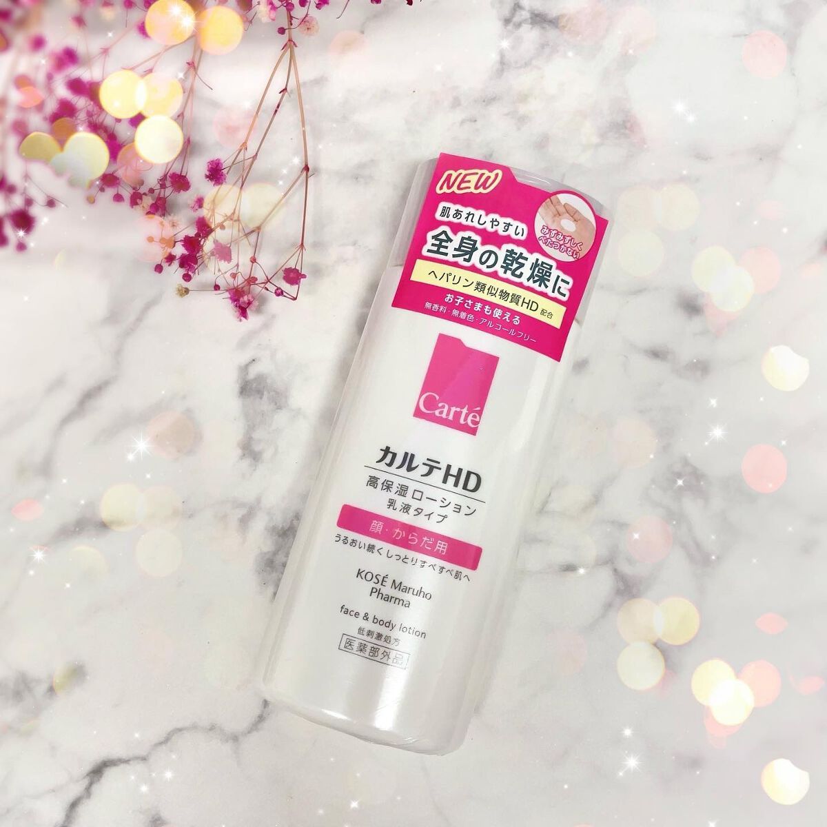 - 【高保湿フェイス&ボディローション】 顔にもからだにも。しっとりやわらか肌つづく。 信頼の保水有効成分「ヘパリン類似物質HD※」配合、低刺激処方の高機能フェイス&ボディローションです。 ヘパリン類似物質HDが、気温・湿度の変化で乾燥しやすいからだの肌のうるおい構造(角層ラメラ)を立て直し、しっとりやわらか肌に導きます。 2種のこだわりオイル配合で、しっとりするのにべたつかず、なめらかにのびひろがる使用感。敏感な肌でもまさつによるストレスがなく、全身をうるおいで満たします。 カルテHDシリーズとしては初めてお子さま(3歳以上)にもお使いいただける商品。 ・ボトルタイプ(220mL) ・ポンプタイプ(410mL) ・つめかえ用(370mL)の3種でラインアップ。 ご自身の保湿に、ご家族や大切なかたの保湿に。みずみずしくなめらかなうるおいが全身を包み込むフェイス&ボディローションです。 ※保水有効成分ヘパリン類似物質のこと <販売名:HD フェイスボディL>