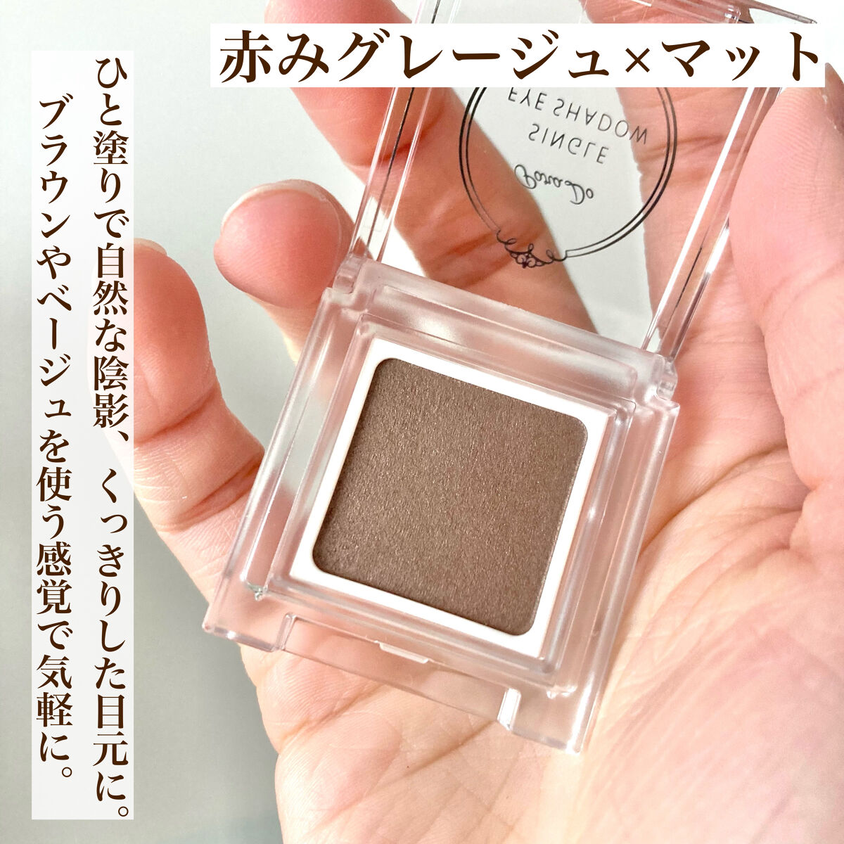 パラドゥのシングルアイシャドウGY01グレージュ おまけでついてました 定価は¥660円 透けるマットとかいうからどんなもんかなって思ってたけど、落ち着く感じ 単色で困ったときに使ってる落ち着いたシーンメモキツく見えないのがいい