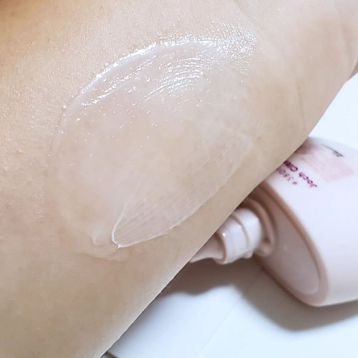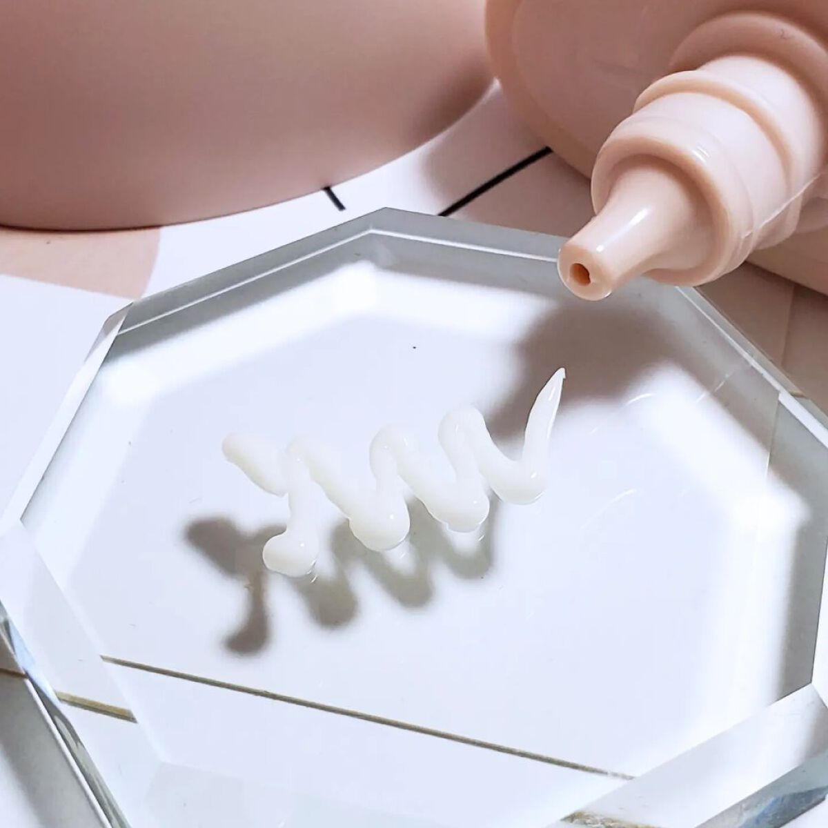 軽い乳液みたいにスルスル伸びて水分感のあるサンエッセンス。 ベタベタしないのに程よくしっとりして日焼け止めってよりほんとにスキンケアって感じ🤭 けどね、油分でメイクが崩れる感じではなくてしっとり水分保湿って感じでメイクのり良くなるやつ! 伸ばすと肌に馴染んで白浮きもしないし 日焼け止め特有のモキュモキュ感もなければ変に乾燥する感じもないし 日焼け止めにブルーライトカット機能もあるってすごい! ポンプなのが使いやすくて衛生的でいい◎