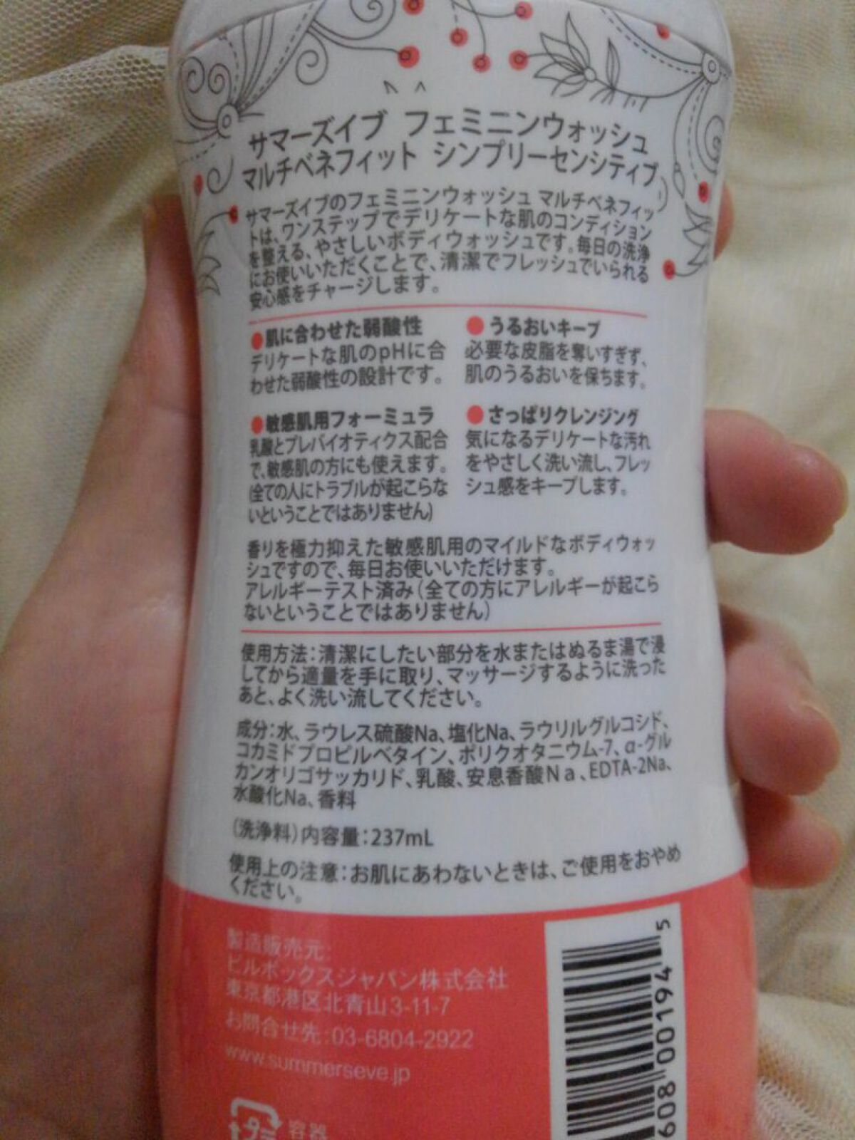 - 肌に優しい使い心地のデリケートゾーン用ボディウォッシュです。デリケートな肌phに合わせてつくられた弱酸性設計。「マルチベネフィット デイリーバランス」よりも、さらに穏やかな処方でつくられた敏感肌用で、香りも抑えめです。潤いをキープしながら、気になるデリケートな汚れをさっぱりクレンジングします。 デリケートゾーンのニオイ*やムレ、カサツキなどに悩まれている方にもおすすめです。 *古い角質や汚れによる 【日米話題のデリケートゾーンケアブランド】 Summer’s Eve(サマーズイブ)は、アメリカで生まれたデリケートゾーンケアブランドです。1972年から、フェムテック分野のパイオニアとして、世界30カ国以上で販売しています。日本での販売は2013年から。アメリカ、日本の両国でデリケートゾーンケアの売上シェア1位*を獲得しています。 *IRI Market Advantageデータ 米国婦人衛生用品ブランド別金額シェア2020年12月調べ(12カ月計) *富士経済「美容家電・化粧雑貨マーケティングトレンドデータ2018」マーケットシェア、デリケートゾーン用洗浄・シート市場、金額ベース、2016年実績 【専門機関による各種テストを実施】 安全性使用テストを発売前にすべての製品で実施 ③パッチテスト*:専門機関監修のもと、一定期間使用し、肌にアレルギー症状が出ないかテスト済 ④エチケット効果テスト:サマーズイブを使用してエチケット対策の変化に関するテストを実施 *すべての方にアレルギーや刺激が起こらないわけではありません。