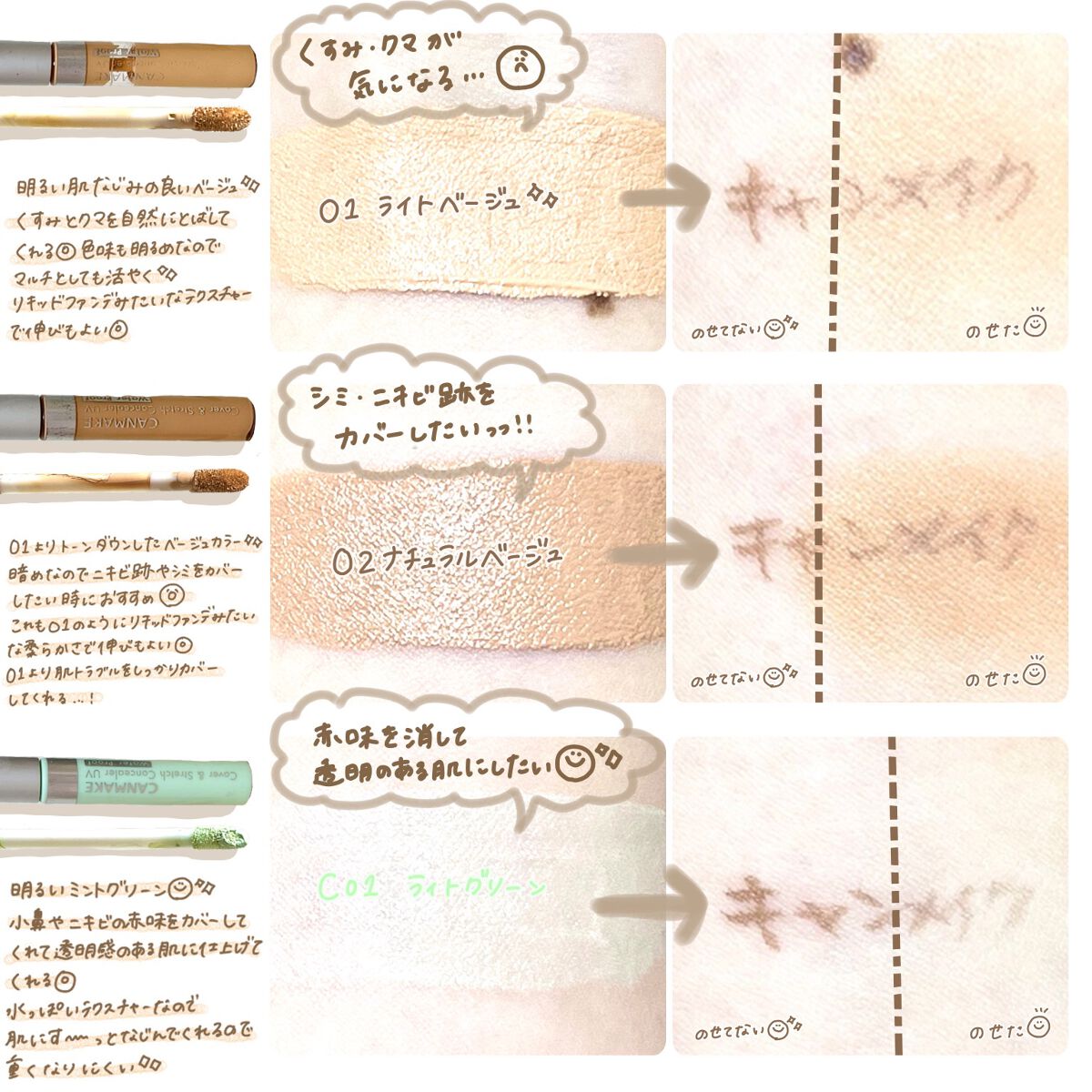 コンシーラー11選🙌持っているコンシーラーを比較してみました🙌✂︎㋖㋷㋣㋷線✂︎1.MISSHAザコンシーラーNo.21テクスチャーは緩めのクリームファンデチップは固めだが液はかなり着くのでちょんちょんのせがおすすめ🐯◎!伸びも程よくいいので...