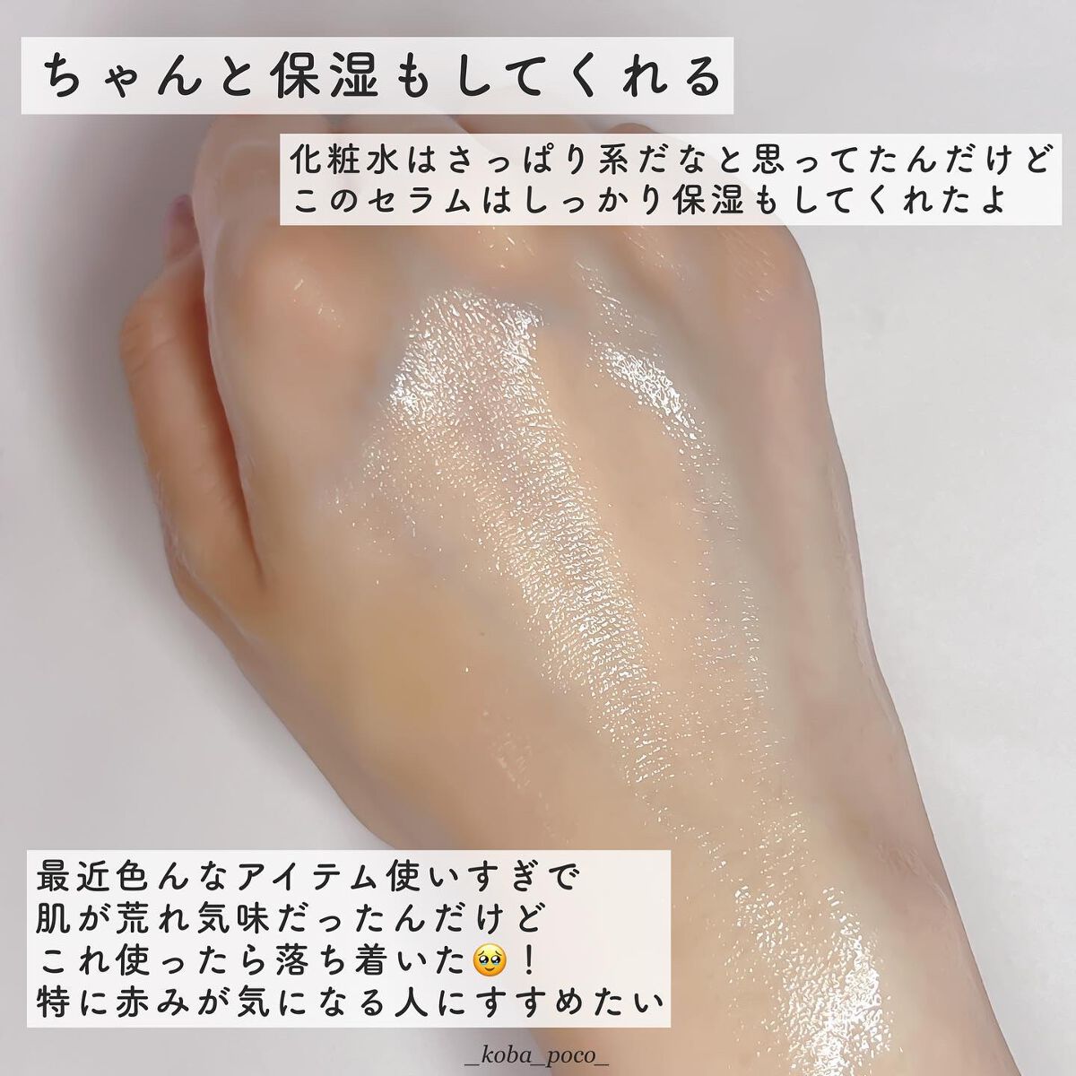 テクスチャはそこまで重くないけどかなりしっとりした塗り心地でべたべたする。 鎮静、保湿にいいと書かれてるけど肌バリア強化とか保湿効果の方が強そうな感じです。 私は脂性肌でヒアルロン酸のべたつきでニキビや肌荒れが悪化してしまうので肌の調子が悪い時に使うのは厳しそう。