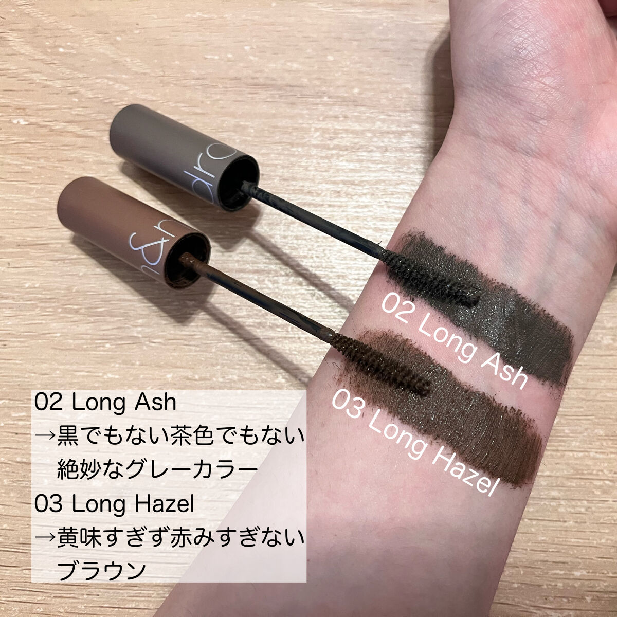 rom&ndのマスカラは繊維が入っているので、自分のまつ毛をそのまま伸ばしましたというよりはちゃんと盛ってもくれるような印象です👍🏻 ボリュームタイプだとケバい感じになってしまう方や目元の印象もちゃんと欲しいという方にはとっても丁度良いです🥰 色味の比較でL02ロングアッシュも載せていますが、こちらのほうが色味も相まってより繊細に見えます🪴