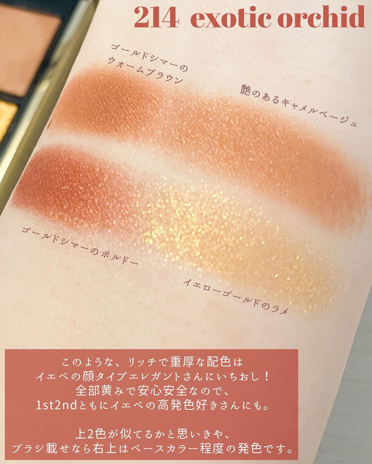 セルヴォークの代名詞とも言える“テラコッタ”を落とし込んだパレット。ソフトマットな質感がメインなのでカジュアルな仕上がりに♡ SUQQUにしては珍しく?トリッキーな色がない。右上が鬼門かと思いきや、ピンクパールのお陰か青ざめないしくすまない👏🏻ピンク系多色ラメも、赤み締め色も大好物🥰 これは絶対に使いやすい。危うさゼロ🥹想像の半分ぐらいの発色なので、初心者さんに一番勧めたいのがこれ!!これも赤みの締め色。というかもはや赤! 上2色、似てるけど使い分けれる?が課題でしたが、意外に右上は薄かったのでセーフ!イエローラメはアディクションの左上に似ています。これには唯一赤みがあるので、棲み分けはできそう。一番濃い目のメイクになりがち。