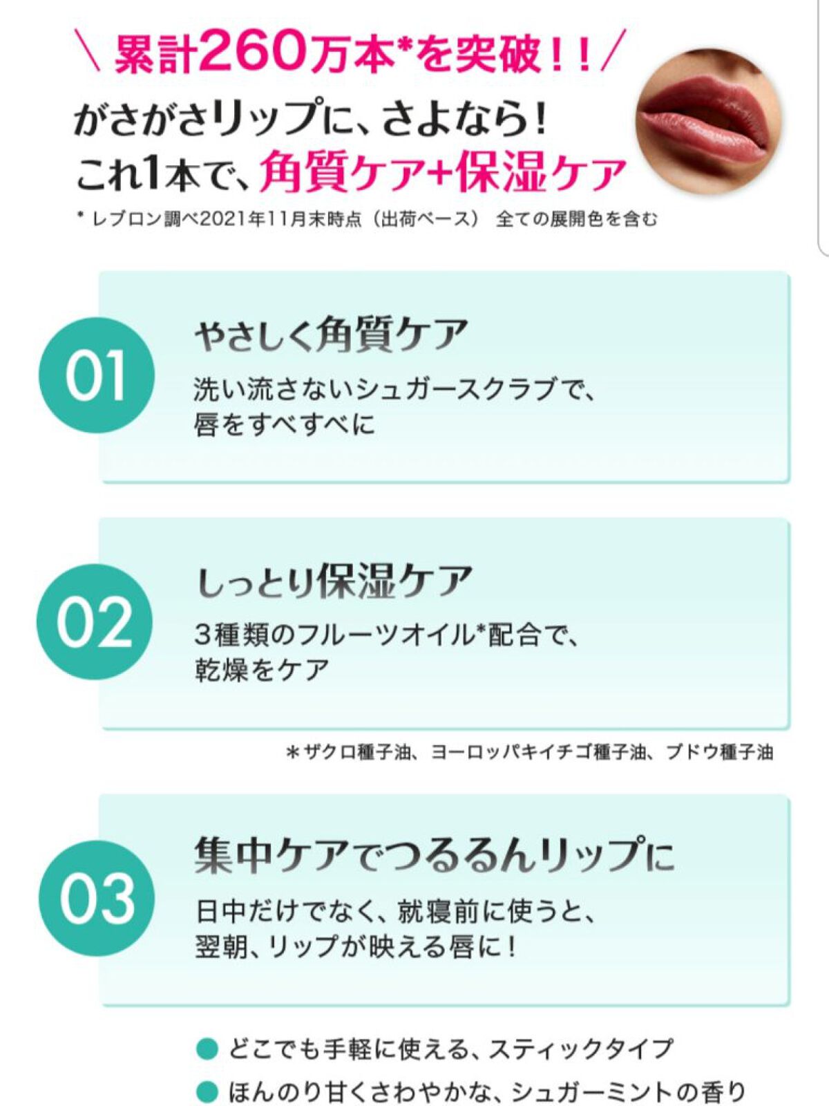- 洗い流さなくてもよいシュガースクラブで、やさしく唇の角質をオフ。 そして、3種類のフルーツオイル*配合で保湿効果も高く、乾燥から唇を守ります。 ひと塗りで、ぷるんとすべすべ、キスしたくなる唇に! *ザクロ種子油、ヨーロッパキイチゴ種子油、ブドウ種子油