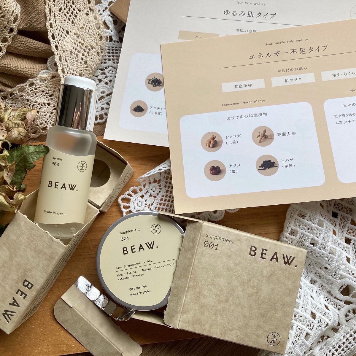 - ・BEAW.のパーソナライズケアは始めにパーソナライズ診断を行い、20種類の和漢と、自然由来の保湿成分の組み合わせから、一人ひとりに合わせた製品をお届けします。 ・現在の自分の悩みにぴったりのパーソナルケアキット、和漢植物由来成分を配合した2剤式のセラムとサプリメントのセットでお届けします。からだの内と外から同時に理想の美しさをめざせるデュアルケアで、あなたの美容をサポートします。 ・美容液は、肌荒れ予防、乾燥、毛穴、テカリ、くすみ*、年齢肌、ツヤ肌、などその人それぞれの悩みに対して適した処方で国産和漢植物成分と、植物エキス、ビタミンやセラミド、プラセンタ、ナイアシンアミド、などを配合した保湿成分を分析結果に合わせて配合。*乾燥による ・サプリメントは体の内側からキレイをサポートする国産和漢植物成分と20種類以上のビタミン、ミネラルをそれぞれに合わせて配合。 -対象商品- BEAW.リッチセラム003、008、015 BEAW.サプリメント:001、007、031 BEAW.フェイスウォッシュ:019、026、045 -内容量- BEAW.リッチセラム:30ml BEAW.サプリメント:60粒 BEAW.フェイスウォッシュ:80g