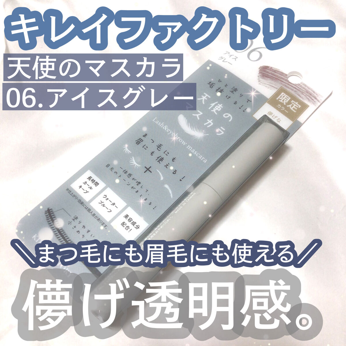 - まつ毛にも眉にも使えるカラーマスカラ。 天使のマスカラシリーズの儚げな印象を低彩度で楽しめる限定色。 色味は抑えめで明度は高めのため、塗るだけで透明感がでて垢抜ける! 低彩度のメイクの差し色や薄眉メイクの選択肢として使える絶妙なカラー。 儚げな天使のようなナチュラルで可愛らしいまつ毛に仕上げます。 まつ毛と眉に使うことでより統一感が増して簡単に垢抜けフェイスに。 繊維配合ウォータープルーフタイプで長時間カールキープ。 まつ毛を保湿する美容保湿成分配合。(パンテノール、ハチミツエキス、アルガニアスピノサ核油*)、アカツメクサ花エキス、シロバナワタエキス、オクタペプチド−2、ユチャ種子油、アセチルテトラペプチド-3 *アルガンオイル