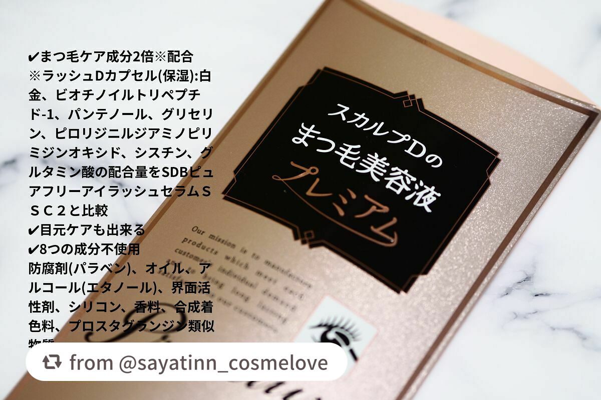 - スカルプDのまつ毛美容液プレミアムは、まつ毛ケア成分を通常品の2倍配合しており、1日1回のケアでもOK♪ さらに、プレミアムには、目元ケア成分配合。まつ毛のハリコシがアップし、上向きカールまつ毛をぐ~んとキープ♪ 使いやすさ・やさしさにこだわった、ふわふわカールチップ採用で根元からも塗りやすく、敏感な目元にやさしい使い心地です。 シリコン、オイル、アルコール(エタノール)、防腐剤(パラベン)、香料、合成着色料、界面活性剤、プロスタグランジン類似物質の8つの成分不使用の“ピュアフリー設計”を実現。 まつ毛エクステ、まつ毛パーマにもご使用いただけます。