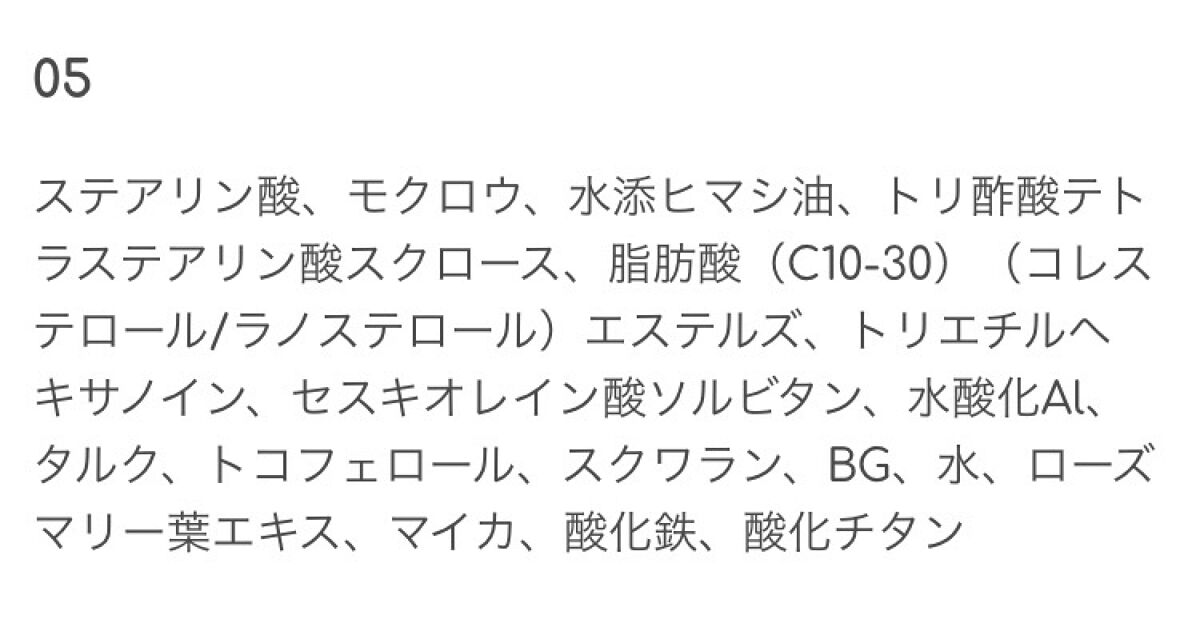 - <01 ライトブラウン> ステアリン酸、モクロウ、水添ヒマシ油、トリ酢酸テトラステアリン酸スクロース、脂肪酸(C10-30)(コレステロール/ラノステロール)エステルズ、トリエチルヘキサノイン、セスキオレイン酸ソルビタン、水酸化Al、タルク、トコフェロール、スクワラン、BG、水、ローズマリー葉エキス、マイカ、酸化鉄、酸化チタン <02 オリーブブラウン> ステアリン酸、モクロウ、水添ヒマシ油、トリ酢酸テトラステアリン酸スクロース、脂肪酸(C10-30)(コレステロール/ラノステロール)エステルズ、トリエチルヘキサノイン、セスキオレイン酸ソルビタン、水酸化Al、タルク、トコフェロール、スクワラン、BG、水、ローズマリー葉エキス、マイカ、酸化鉄、酸化チタン <03 ナチュラルブラウン> ステアリン酸、モクロウ、水添ヒマシ油、トリ酢酸テトラステアリン酸スクロース、脂肪酸(C10-30)(コレステロール/ラノステロール)エステルズ、トリエチルヘキサノイン、セスキオレイン酸ソルビタン、水酸化Al、タルク、トコフェロール、スクワラン、BG、水、ローズマリー葉エキス、マイカ、酸化鉄、酸化チタン <04 ディープブラウン> ステアリン酸、モクロウ、水添ヒマシ油、トリ酢酸テトラステアリン酸スクロース、脂肪酸(C10-30)(コレステロール/ラノステロール)エステルズ、トリエチルヘキサノイン、セスキオレイン酸ソルビタン、水酸化Al、タルク、トコフェロール、スクワラン、BG、水、ローズマリー葉エキス、マイカ、酸化鉄、酸化チタン <05 ナチュラルグレー> ステアリン酸、モクロウ、水添ヒマシ油、トリ酢酸テトラステアリン酸スクロース、脂肪酸(C10-30)(コレステロール/ラノステロール)エステルズ、トリエチルヘキサノイン、セスキオレイン酸ソルビタン、水酸化Al、タルク、トコフェロール、スクワラン、BG、水、ローズマリー葉エキス、マイカ、酸化鉄、酸化チタン <06 ビターグレージュ> ステアリン酸、モクロウ、水添ヒマシ油、トリ酢酸テトラステアリン酸スクロース、脂肪酸(C10-30)(コレステロール/ラノステロール)エステルズ、トリエチルヘキサノイン、セスキオレイン酸ソルビタン、水酸化Al、タルク、トコフェロール、スクワラン、BG、水、ローズマリー葉エキス、マイカ、酸化鉄、酸化チタン