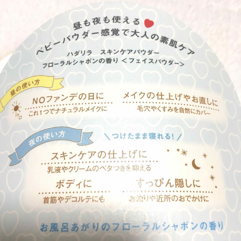 - 昼も夜も使える大人のベビーパウダー すべすべスキンケアパウダー「ハダリラ 」で、今日はお肌もわたしもリラックス。 昼も夜も使える、ベビーパウダー感覚で大人の素肌ケア
