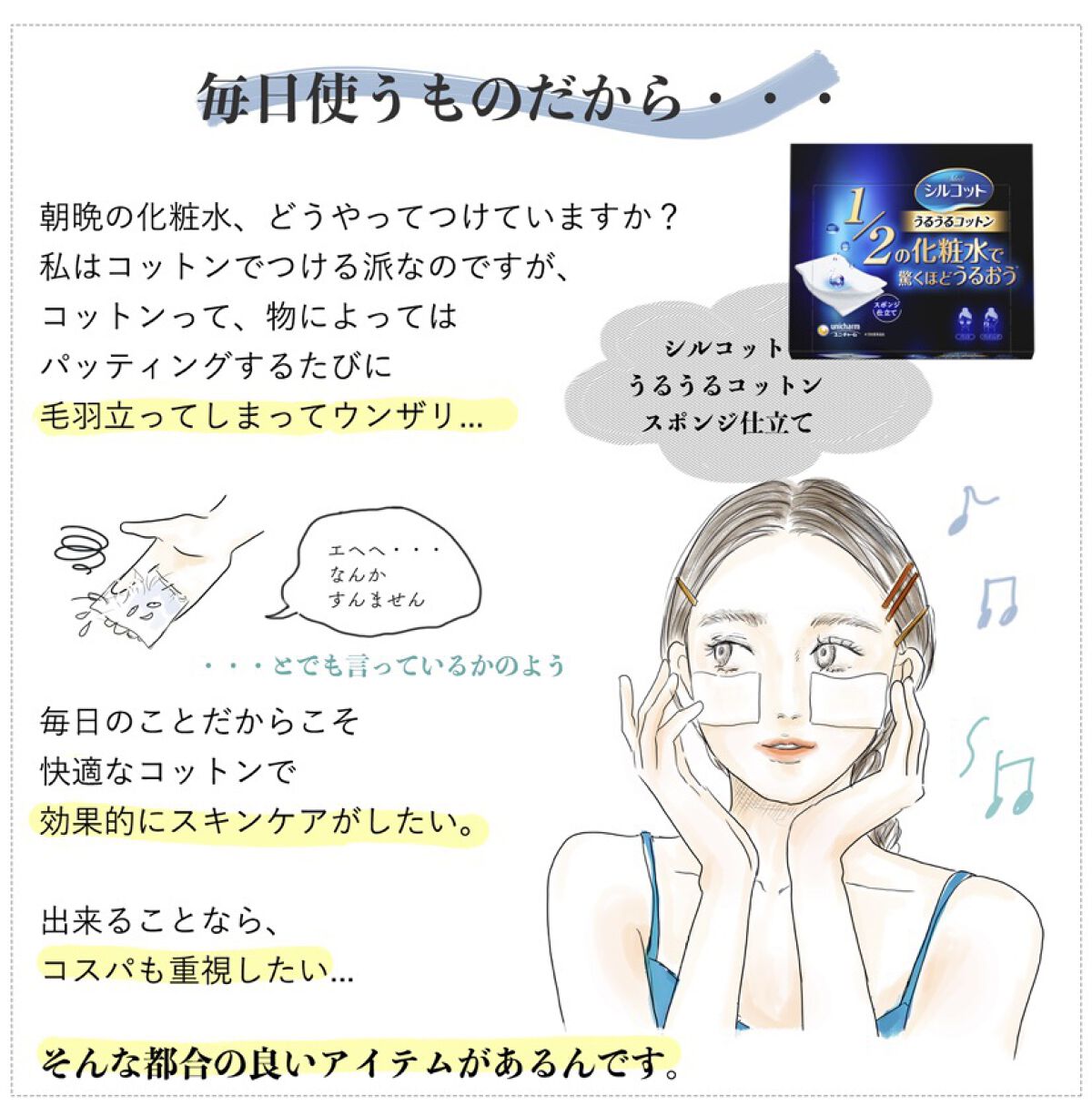 - ポイント①1/2の化粧水で驚くほどうるおう※1 じゅわっと染み出るスポンジ構造採用。化粧水の出てくる量がシルコットの2倍以上で、コットン本体に化粧水を殆ど残しません!※1当社製品比 ポイント②パッティングしても、はがしてもパックしても毛羽立たず、やわらか ポイント③2枚にはがせて目元にピタッと密着 2枚にはがしてパックできます。 目元にフィットしやすいカーブ形状です。